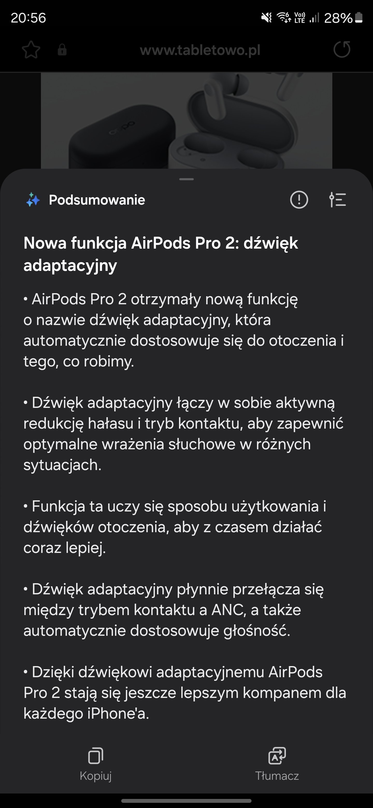 Ostatnia publikacja felietonowa to ocena Adaptive Audio, wykonana przez Kordasa. I tu znowu Samsung na prowadzeniu, bo – gdy Edge podaje nam informację, że autor sprawdzał, jak tryb działa w różnych scenariuszach – tak przeglądarka Samsunga podsuwa od razu info na temat tego, jak spisywał się podczas testów.
