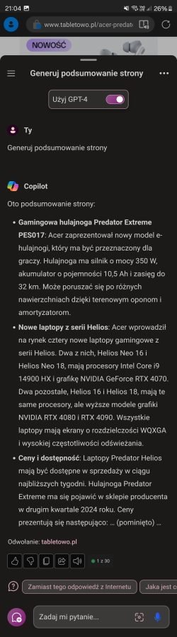 Ostatni z newsów to tekst o premierze hulajnogi i laptopów Acera. Tu w przeglądarce Samsung zabrakło informacji o cenach, ale zwróćcie uwagę, że w Edge, z użyciem GPT-4, asystent chciał wymienić ceny, po czym… pominął je. Arcyciekawe zagranie.