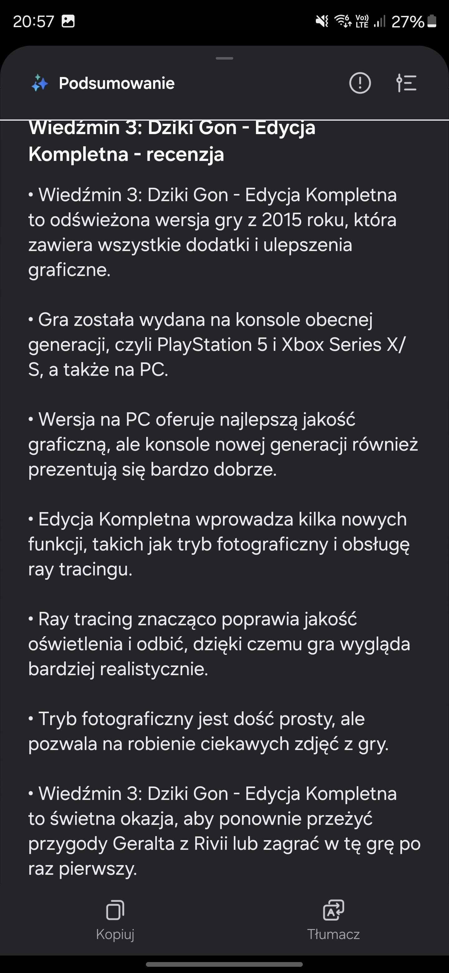 I jeszcze jedno porównanko – tym razem Wiedźmin 3: Dziki Gon w 2015 vs 2022 roku. Tutaj oba mechanizmy podeszły do podsumowania materiału nieco inaczej, przez co trudno jest zdecydować, który zrobił to lepiej (pomijając opcję z GPT-4, bo w niej zabrakło informacji o tym, jaka jest opinia autora).