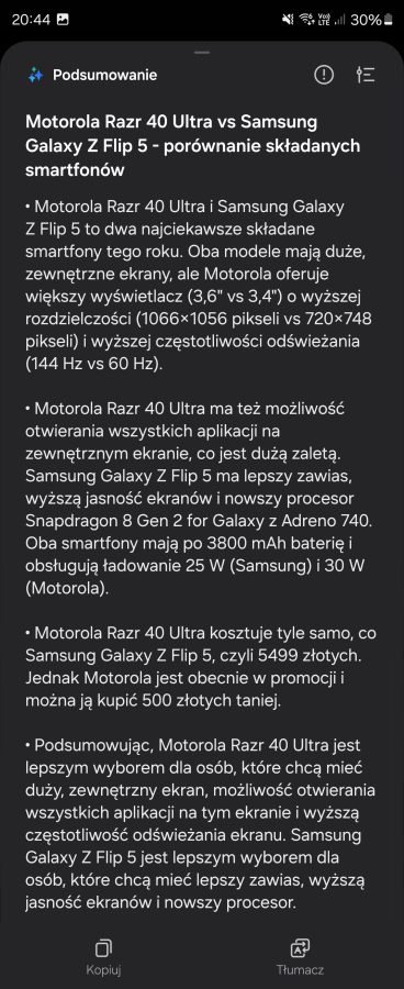 Jako drugie porównanie skusiłam się na mój tekst – Moto Razr 40 Ultra vs Samsung Galaxy Z Flip 5 trochę z ciekawości czy mechanizmy ogarną, że pisała je kobieta. Tutaj plus dla Edge :) Ale samo podsumowanie jest bardziej “mięsiste” w przypadku Samsunga.