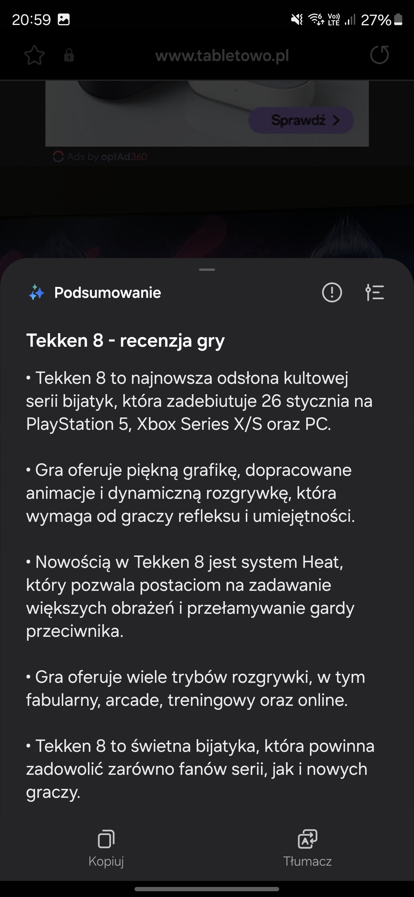Na koniec zostawiłam recenzję gry, bo w sumie dlaczego nie. Padło na Tekkena 8. I tu znowu… co ten Samsung sobie zmyśla. W tekście jest mowa o tym, że gra zadebiutuje 26 stycznia 2024 roku, podczas gdy w podsumowaniu mamy info, że premiera miała miejsce tego dnia, owszem, ale rok wcześniej. W Edge dostajemy na tacy informacje o problemach i aspekty, za które Tekken 8 jest chwalony.