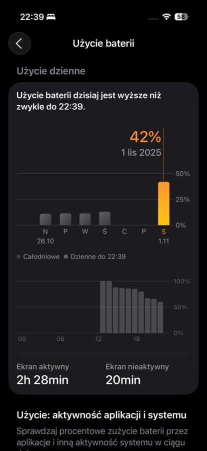 W swojej recenzji Pixela 10 Karol pisał, że nie trzeba się obawiać, że wychodząc z domu rano, będziemy musieli zadbać o doładowanie urządzenia w ciągu dnia. Ja niestety tego samego powiedzieć na temat iPhone’a 17 nie mogę – na 5G trzy-cztery godziny włączonego ekranu to maks, jaki udawało mi się uzyskiwać, co w rękach osób intensywnie korzystających z telefonu oznaczać będzie szybką konieczność podładowywania go.