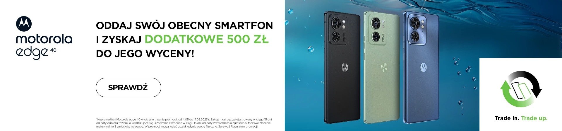 Otóż producent uruchomił przedsprzedaż, która potrwa do 17 maja. W tym czasie można skorzystać z programu „Trade in. Trade up”, który pozwala na na oddanie innego smartfonu do recyklingu. Firma Motorola wraz z partnerem akcji wycenią stare urządzenie i wypłacą konsumentowi gwarantowane 500 złotych + kwotę proponowanej wyceny. Przypomina to więc promocje „Odkup”, organizowane cyklicznie przez Samsunga.