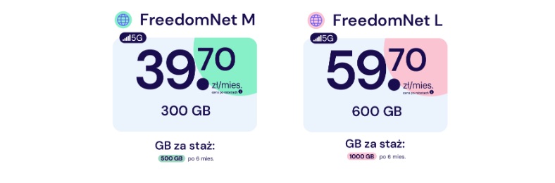 W przypadku oferty FreedomNet M wycenionej na 39,70 złotych miesięcznie pakiet 300 GB wzrośnie do 500 GB po 6 miesiącach. Z kolei w taryfie FreedomNet L za 59,70 złotych miesięcznie pakiet zwiększy się z 600 GB do 1000 GB po 6 miesiącach. Każdy kolejny abonament na telefon lub kolejny internet mobilny 5G kosztuje 20,70 złotych miesięcznie.
