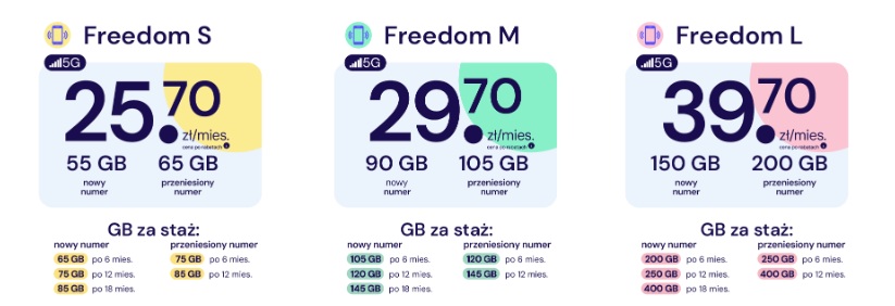 Najtańszy Freedom S wyceniono na 25,70 złotych miesięcznie i na start zawiera on pakiet 55 GB (dla nowych numerów) lub 65 GB (dla przeniesionych numerów). Paczka gigabajtów rośnie o 10 GB za każde kolejne 6 miesięcy stażu, aż do 85 GB. Nieco bogatszy wariant – Freedom M – wyceniono zaś na 29,70 złotych za miesiąc i obejmuje on paczkę 90 GB (nowy numer) lub 105 GB (przeniesiony numer). Pakiety rosną co 6 miesięcy stażu o kolejne 15 GB (aż do 145 GB).