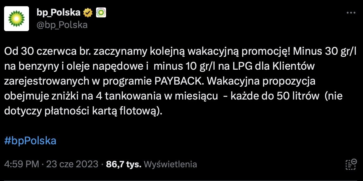 Podobnie jak w zeszłym roku, po ogłoszeniu rabatów przez Orlen, własne promocje zapowiedziały również inni. BP poinformowało, że od 30 czerwca bieżącego roku rozpocznie kolejną wakacyjną promocję. Klienci mogą zaoszczędzić 30 groszy na każdym litrze benzyny i oleju napędowego, a także 10 groszy na litrze na LPG.
