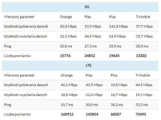 Ciekawie wygląda również sytuacja dotycząca opóźnienia – mediana w Orange wynosiła 42 ms, w Play i T-Mobile 43 ms, a w Plusie 45 ms. Różnice nie są zatem ogromne jak w rankingu SpeedTest.pl, gdzie średnia w Orange i T-Mobile wyniosła 28 ms, w Play 29 ms, a w Plusie aż 37 ms. Niezmiennie jednak Plus ma najszybsze 5G – w drugim kwartale mediana prędkości pobierania to 153,19 Mbit/s, podczas gdy w T-Mobile 69,35 Mbit/s, w Orange 66,67 Mbit/s, a w Play 61,25 Mbit/s.