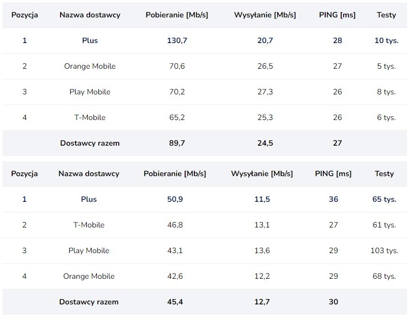 Bez zaskoczenia to właśnie w Plusie prędkość pobierania była najwyższa, zarówno w samej technologii 5G (130,7 Mbit/s), jak i we wszystkich razem wziętych (50,9 Mbit/s). Na tym jednak dominacja Plusa się kończy, gdyż zarówno pod względem średniej prędkości wysyłania danych, jak i średniego opóźnienia (ping) operator ten przegrał z konkurencją – jego wyniki są najgorsze (odpowiednio znacznie poniżej oraz powyżej średniej).