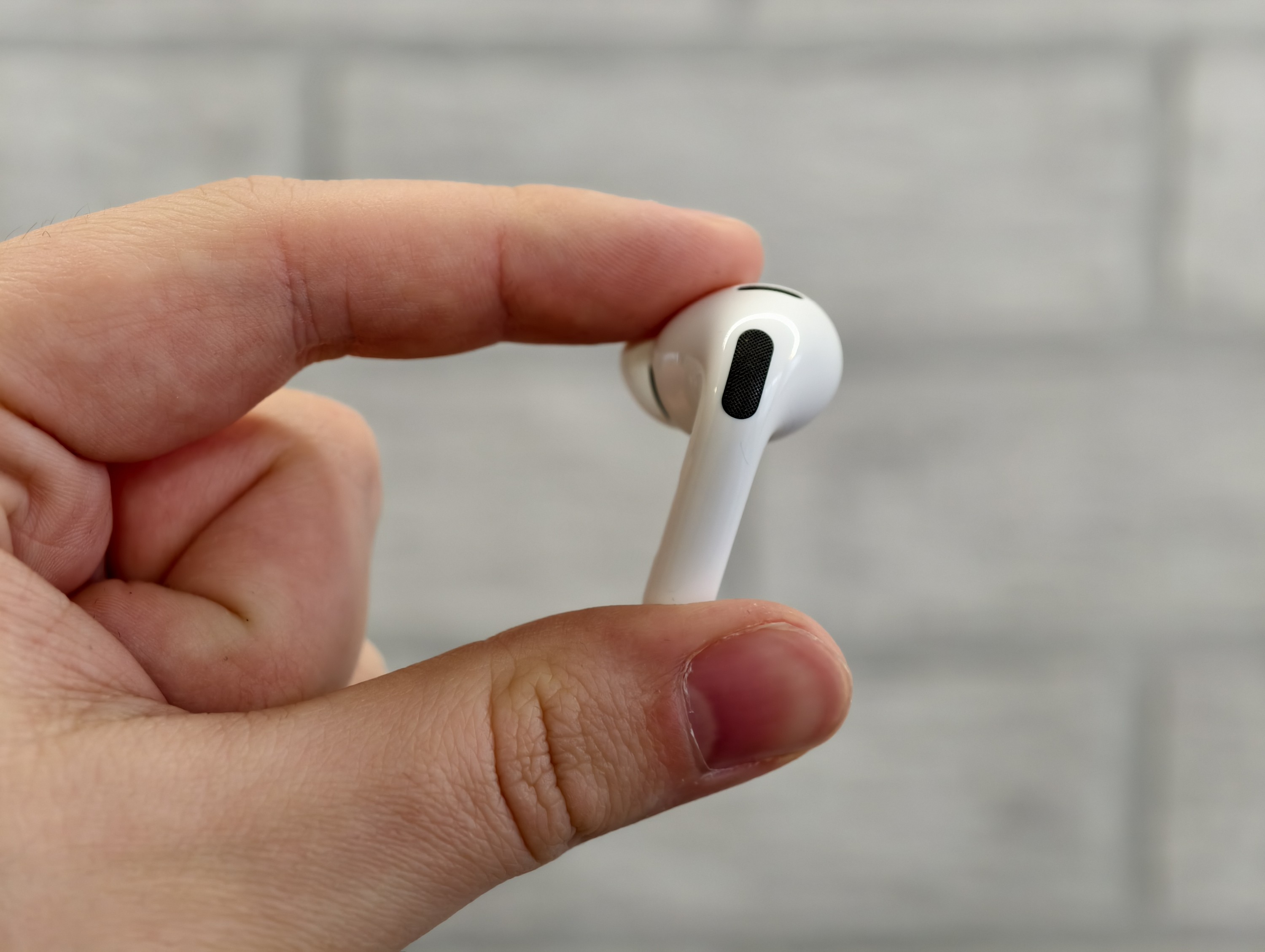 AirPods Pro 3 oferują doskonale znany już sposób sterowania poprzez uszczypnięcia trzpieni słuchawek w odpowiednio wyżłobionych ku temu miejscach. Podobnie jak w poprzedniej generacji, poza szczypaniem panele dotykowe rozpoznają też przesunięcia palcem.