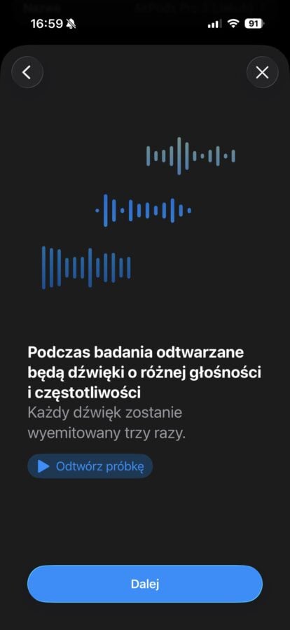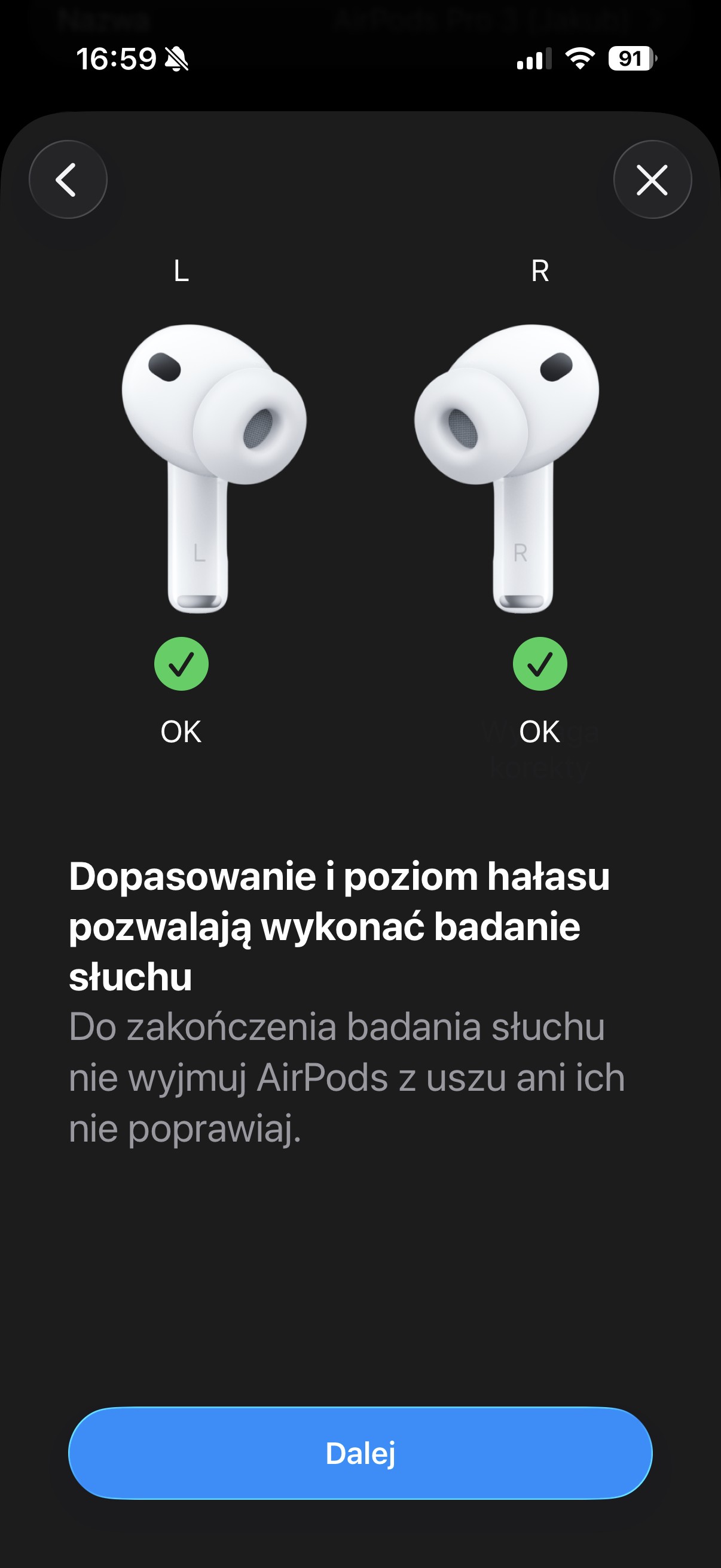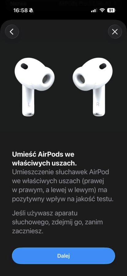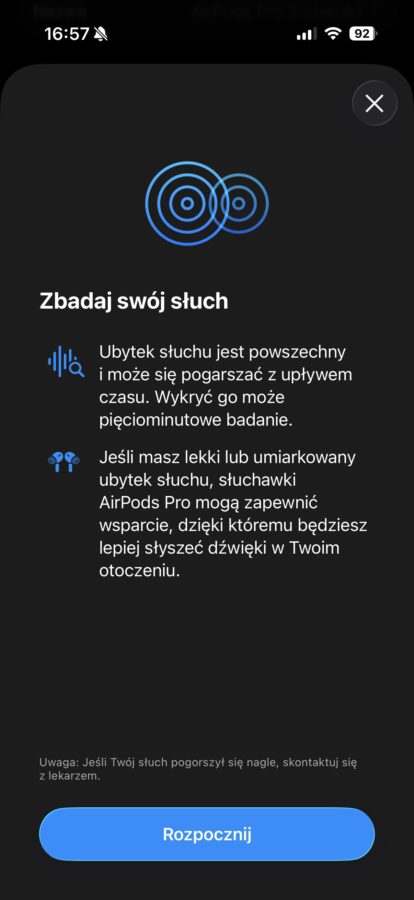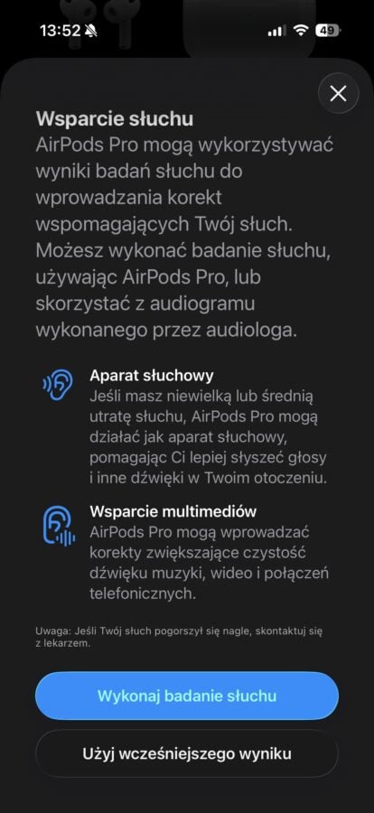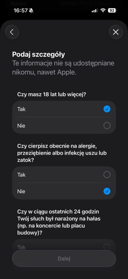 Jeśli badanie słuchu wykaże ubytki, możemy skalibrować AirPods Pro 3 jako aparat słuchowy, którego działanie opiera się na trybie kontaktu. Z racji, że (na szczęście) mój słuch wciąż jest w bardzo dobrym stanie, nie miałem okazji sprawdzić działania tej funkcji.