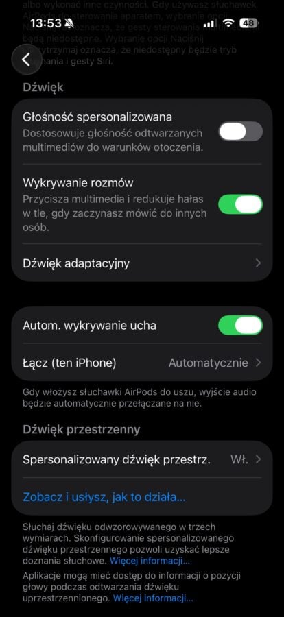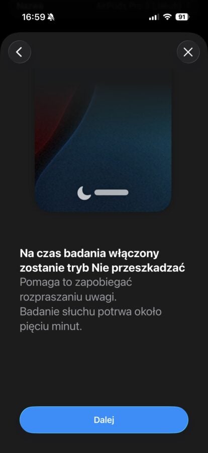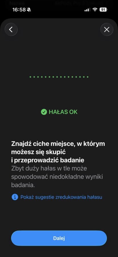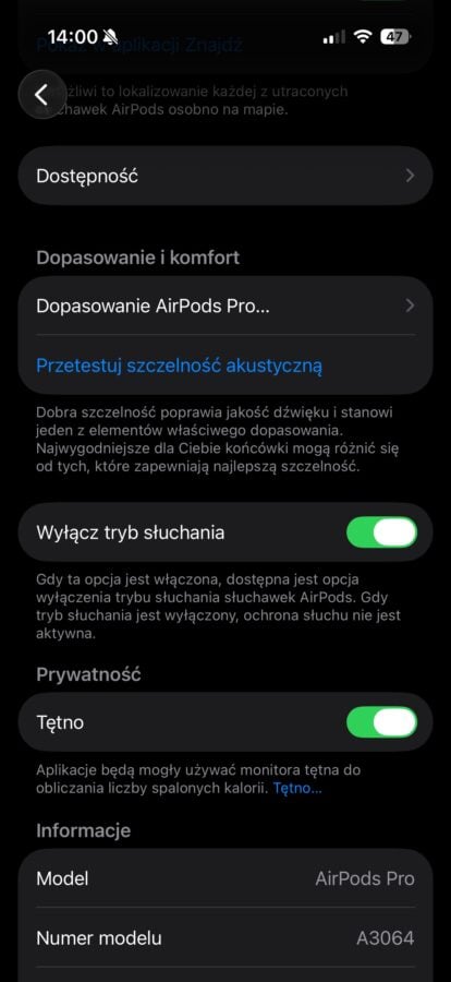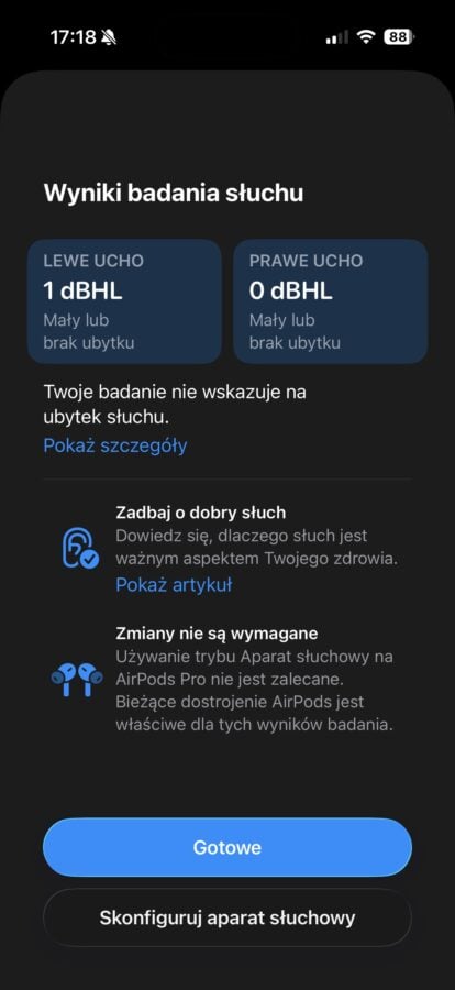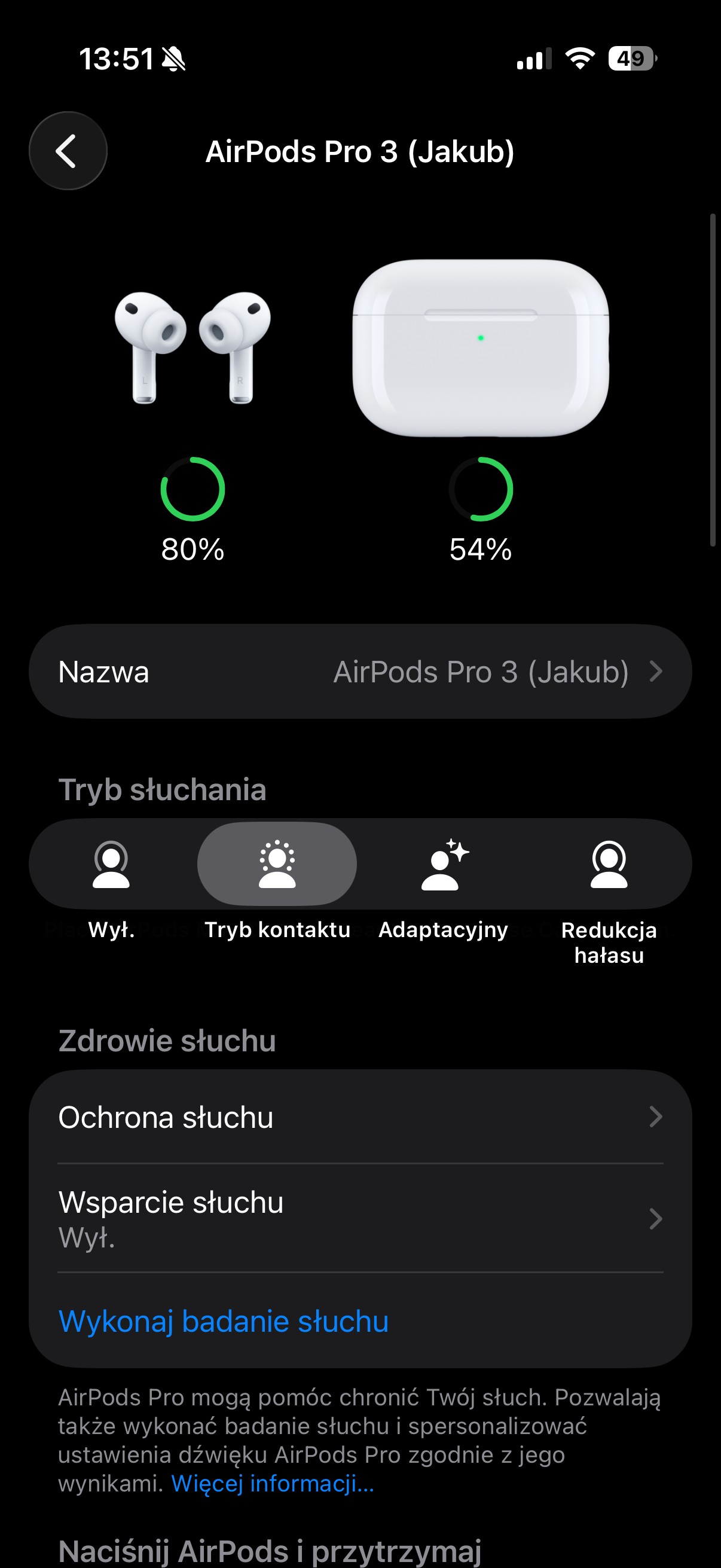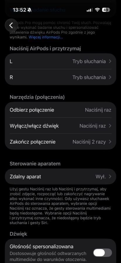 Jeśli badanie słuchu wykaże ubytki, możemy skalibrować AirPods Pro 3 jako aparat słuchowy, którego działanie opiera się na trybie kontaktu. Z racji, że (na szczęście) mój słuch wciąż jest w bardzo dobrym stanie, nie miałem okazji sprawdzić działania tej funkcji.