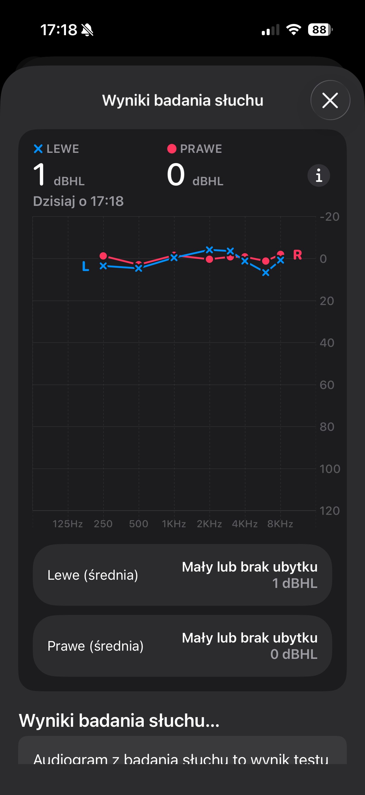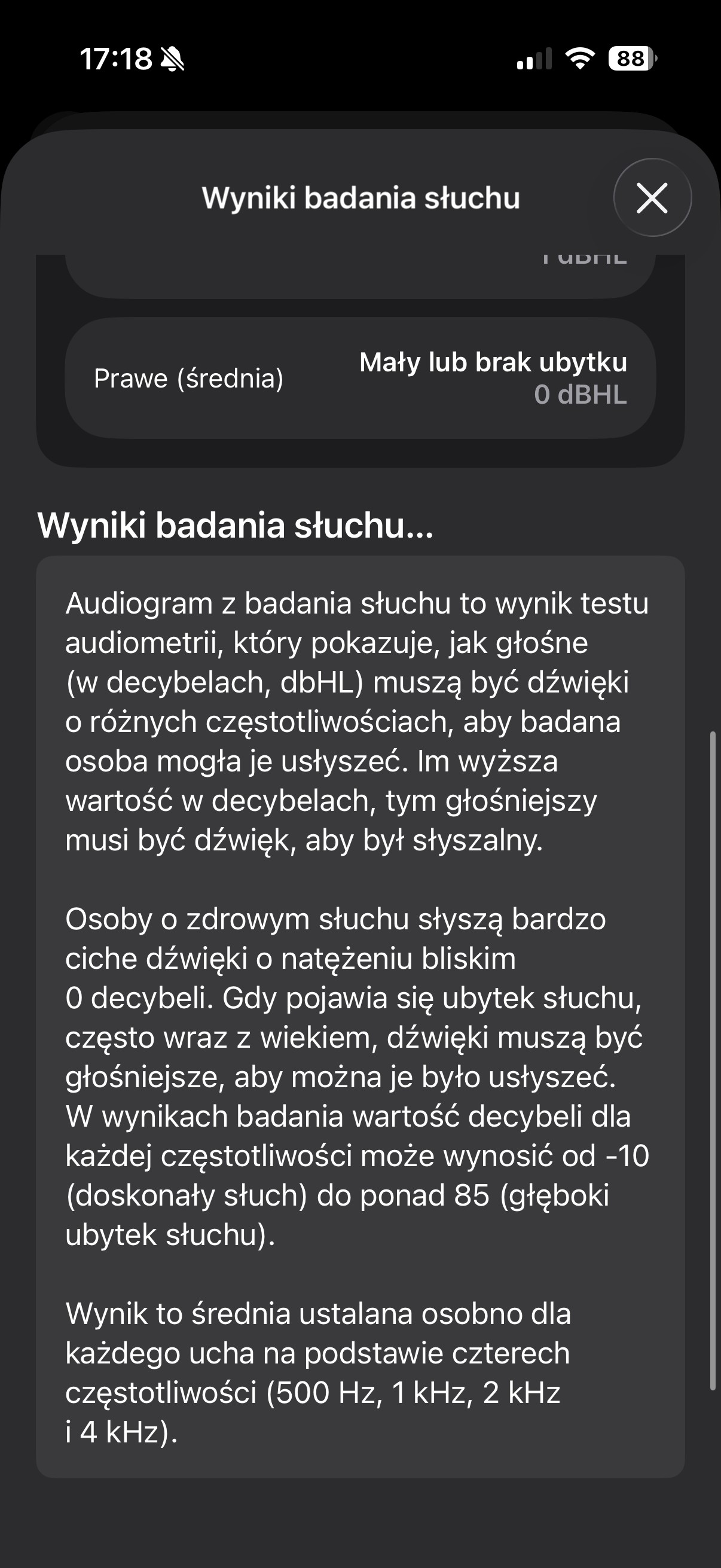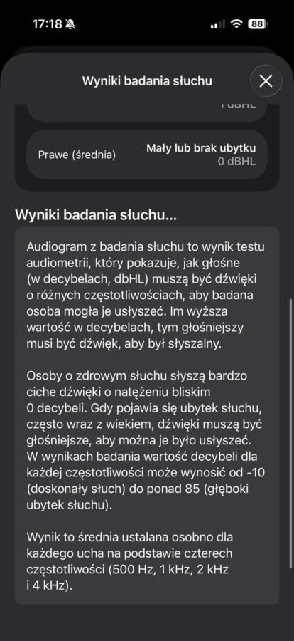 Wynik podawany jest w jednostce dBHL (decbels hearing level) – im niższa liczba, tym mniejszy ubytek słuchu. Przykładowo: -10 dBHL oznacza brak ubytku słuchu, a ponad 85 dBHL to już głęboki ubytek słuchu. Mój test pokazał wartości 1 i 0, co zostało zaklasyfikowane jako mały lub brak ubytku. Ufff.