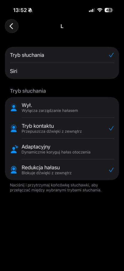 Aby wejść do pełnych ustawień, musimy wejść do ustawień iPhone’a lub iPada – tam, już na samej górze, widoczny jest odnośnik do opcji poświęconych połączonym słuchawkom. Od góry widzimy poziom naładowania baterii oraz przełączniki trybów ANC.
