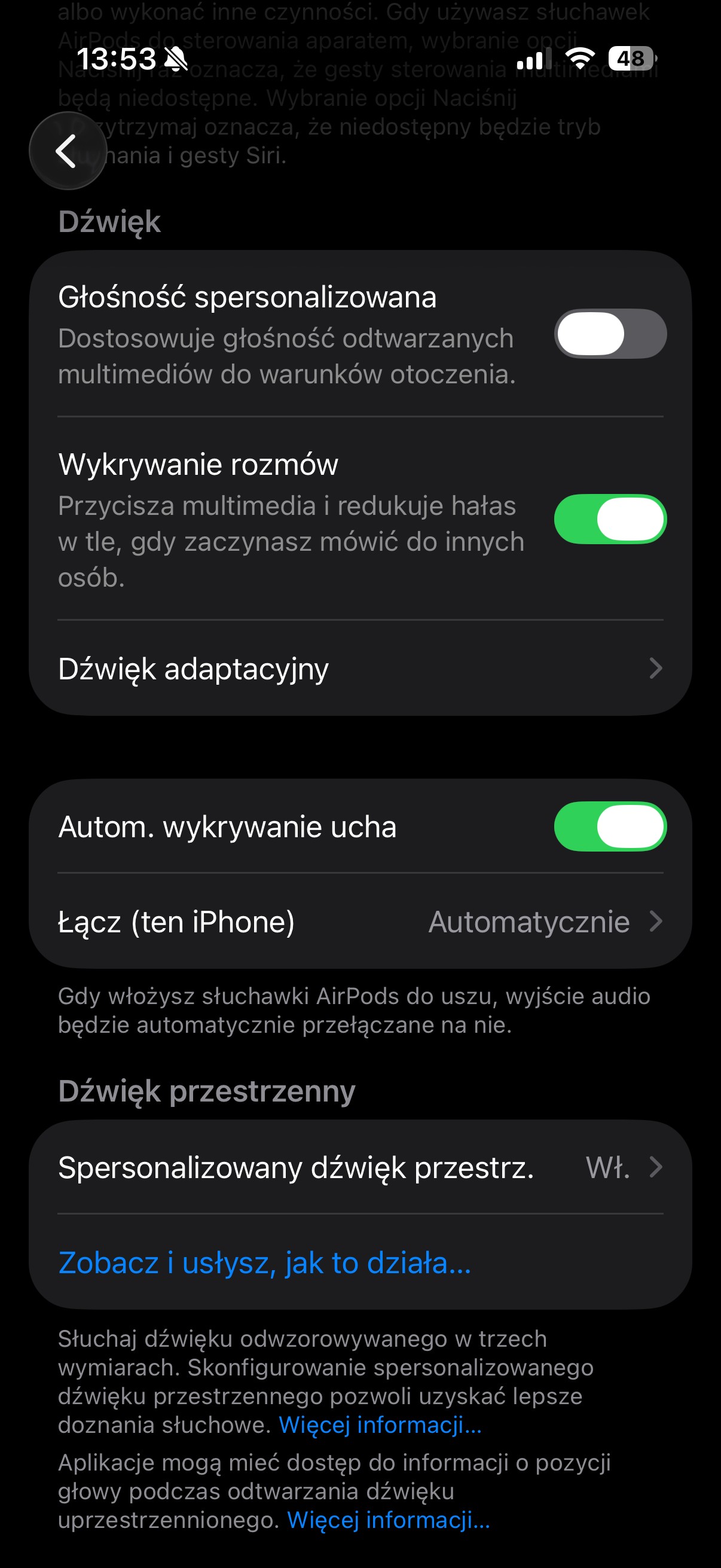 Niezmiennie brakuje mi tutaj korektora dźwięku w postaci graficznego equalizera, albo kilku gotowych, nawet najbardziej podstawowych presetów, które pozwoliłyby choć lekko zmodyfikować brzmienie. W zasadzie jedynym, czym możemy się posiłkować, jest equalizer dla aplikacji Apple Music lub Spotify, ale wówczas nie działają one globalnie na całe strojenie słuchawek, a tylko odtwarzając w tych konkretnych apkach.