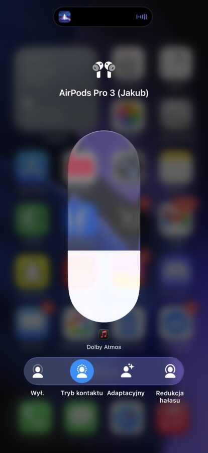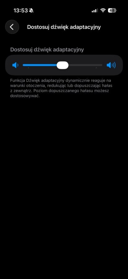 Pomiędzy trybami ANC i kontaktu jest jeszcze Tryb Adaptacyjny. Pierwszy raz wprowadzono go dwa lata temu jako aktualizacja dla modelu AirPods Pro 2.