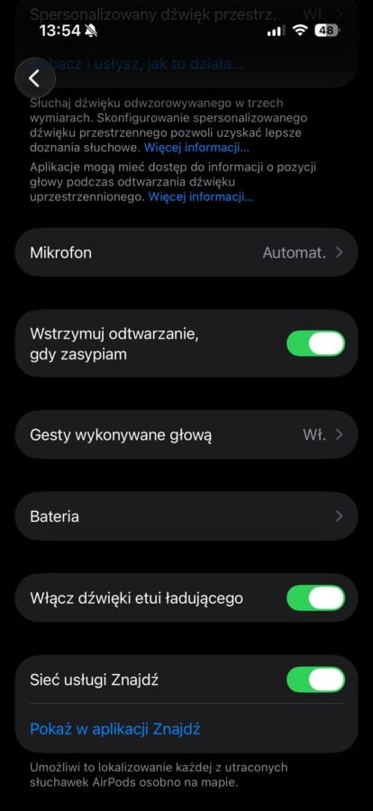 Nie da się ukryć, że to dość spora różnica, ale finalnie nowe trójki i tak są w stanie posłużyć nam przynajmniej przez parę dni bez ładowania. Sprawia to, że – w ogólnym rozrachunku – czas pracy AirPods Pro 3 wypada po prostu dobrze, choć bez większych zachwytów.