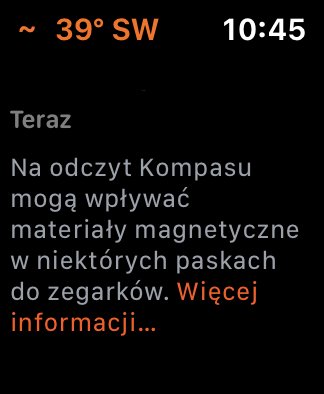 W interfejsie nowej wersji zegarka znalazła się teraz aplikacja Kompas. Na temat jej użyteczności trudno mi się w jakiś sposób wypowiedzieć. Nie twierdzę, że wskazywanie długości i szerokości geograficznej, w jakiej obecnie się znajdujemy, nie będzie dla nikogo przydatne, dla przeciętnego Kowalskiego implementacja kompasu będzie miała jednak inne, praktyczne zastosowanie – korzystająca z niego aplikacja mapy, pokaże nam teraz dokładny kierunek, w jakim powinniśmy się udać podczas wyszukiwania danego adresu. Działanie kompasu może być zakłócane przez znajdujące się w niektórych paskach magnetyczne zapięcia – Apple informuje o tym w jednym z komunikatów w wewnątrz aplikacji.