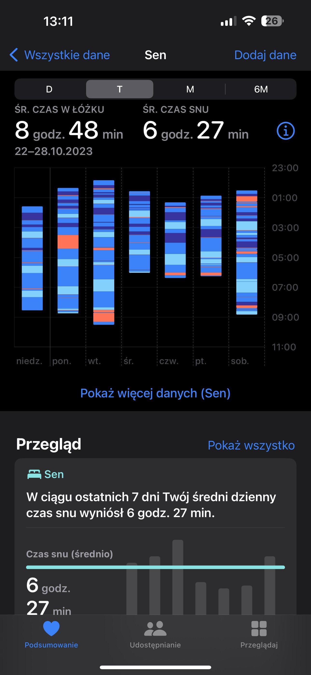 Nie zabrakło również monitorowania snu, jednakże aby w ogóle się ono odbywało, najpierw musimy skonfigurować tryb skupienia Sen na smartfonie. Ustawiamy wówczas harmonogram włączania i wyłączania tego trybu dla poszczególnych dni tygodnia. Wówczas nie spływają do nas powiadomienia (chyba, że ustawimy inaczej) i wyłącza się Always on Display.