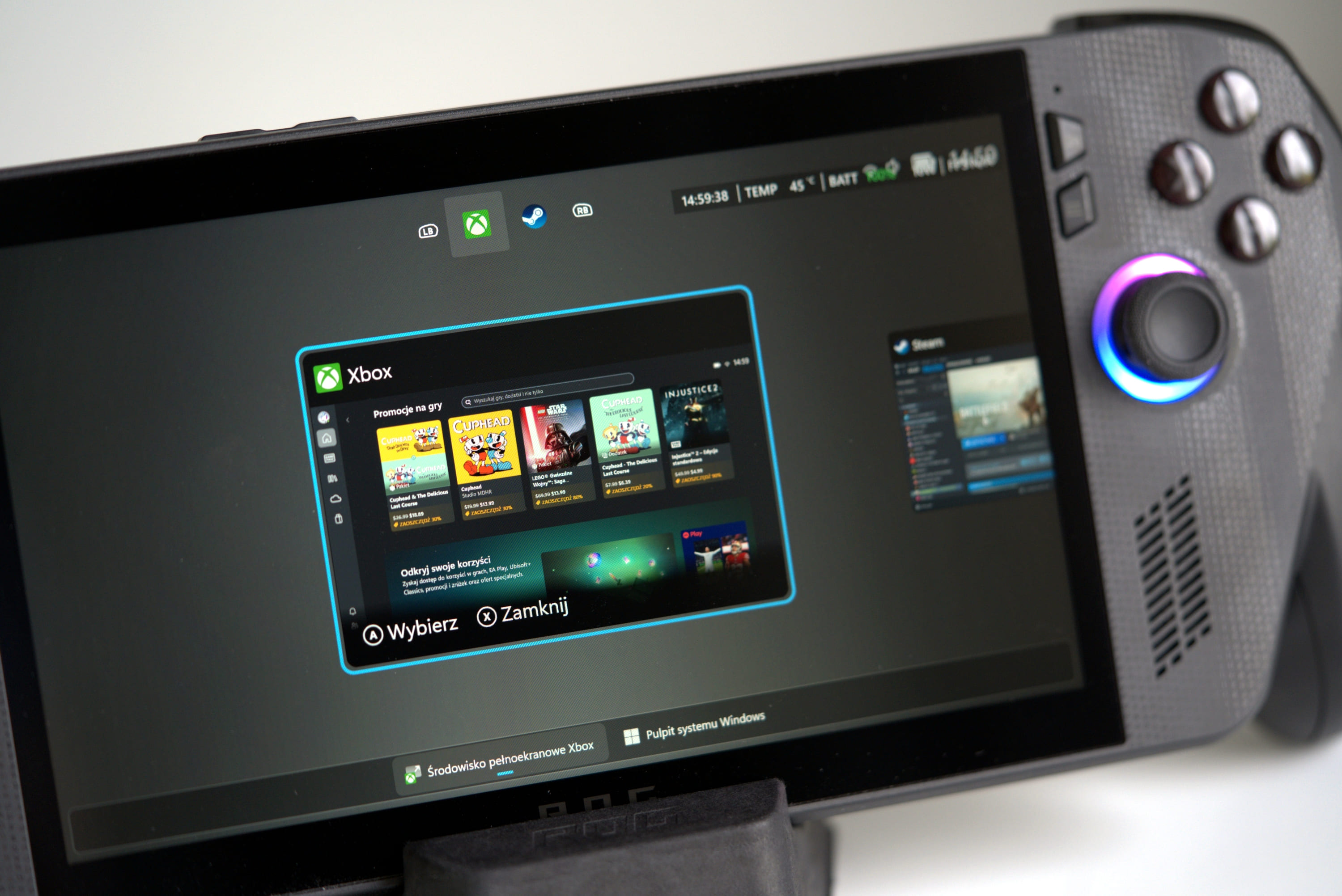 Na szczęście, testowanej dziś konsoli możemy używać w dwóch trybach – z pulpitem systemu Windows lub w trybie pełnoekranowym konsoli Xbox (nazywanym przeze mnie roboczo Xbox UI). Drugi z nich określiłabym mianem osobnej przestrzeni na urządzeniu, dedykowanej wyłącznie środowisku growemu, gdzie obsługa analogami i przyciskami jest czystą przyjemnością (w przeciwieństwie do pulpitu), a i urządzenie skierowane jest wyłącznie na te funkcje, ograniczając pozostałe procesy w tle do minimum. Co ważne, mamy tu dostęp nie tylko do gier z Xbox Game Pass, ale też pozostałych usług – typu Steam.