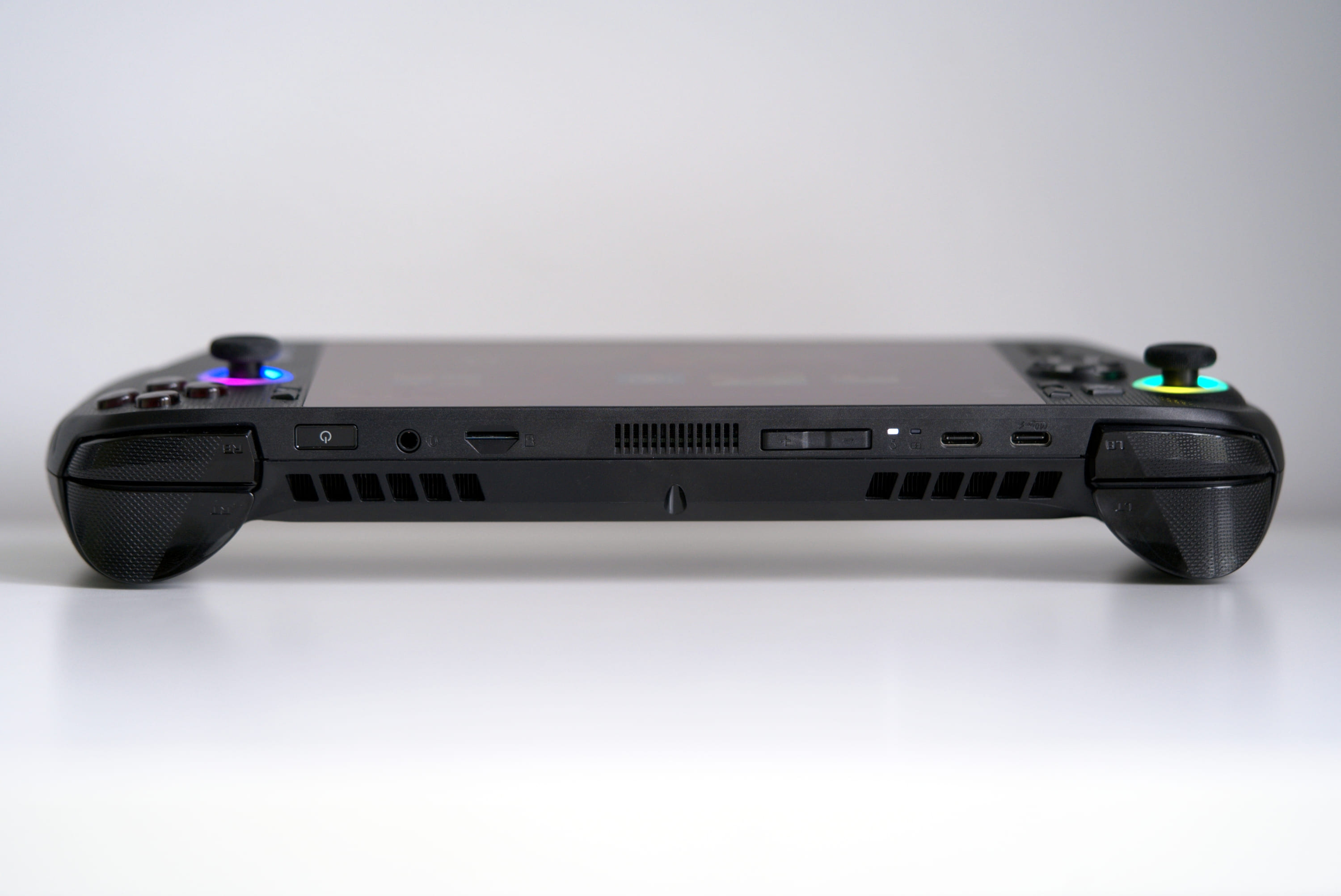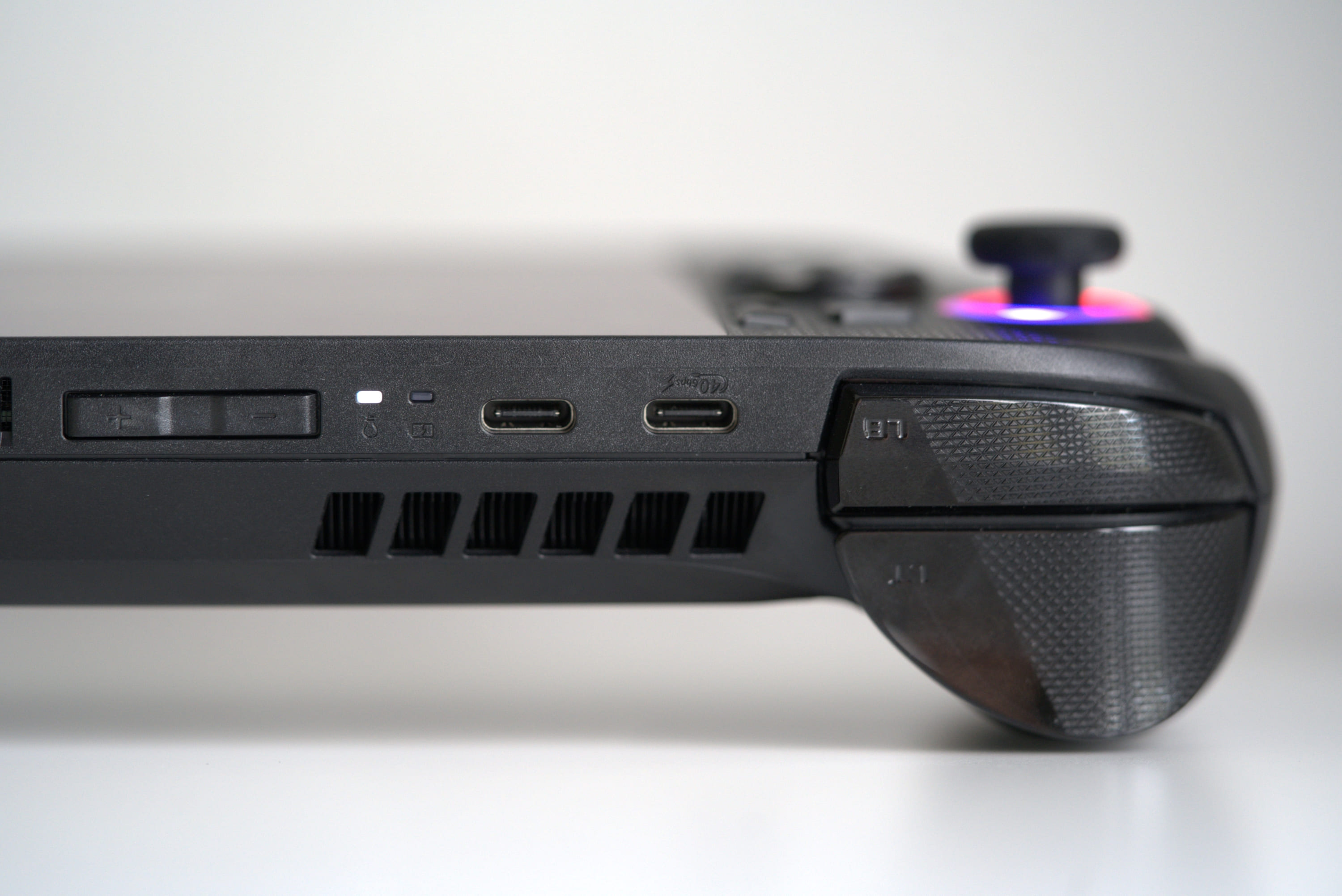 Skoro mamy do czynienia z handheldem, najważniejsze są wszelakie przyciski, analogi, triggery, etc. Idąc od góry, mamy fajne, teksturowane spusty, na których palce się nie ślizgają, a także… przyciski regulacji głośności i włącznik, w którym zaszyty został czytnik linii papilarnych (fajne!).