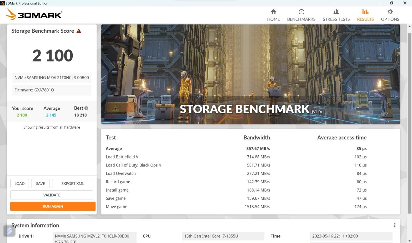 Dane zapiszemy na dysku SSD M.2 NVMe PCIe 4.0 o pojemności 1 TB. Konkretnie jest to dysk Samsung PM9A1 (MZVL21T0HCLR-00B00), który osiąga szybkość odczytu na poziomie 7000 MB/s i zapisu 5100 MB/s – przynajmniej w teorii. W praktyce jest nieco gorzej, co możecie zobaczyć po wynikach uzyskanych w testach syntetycznych: