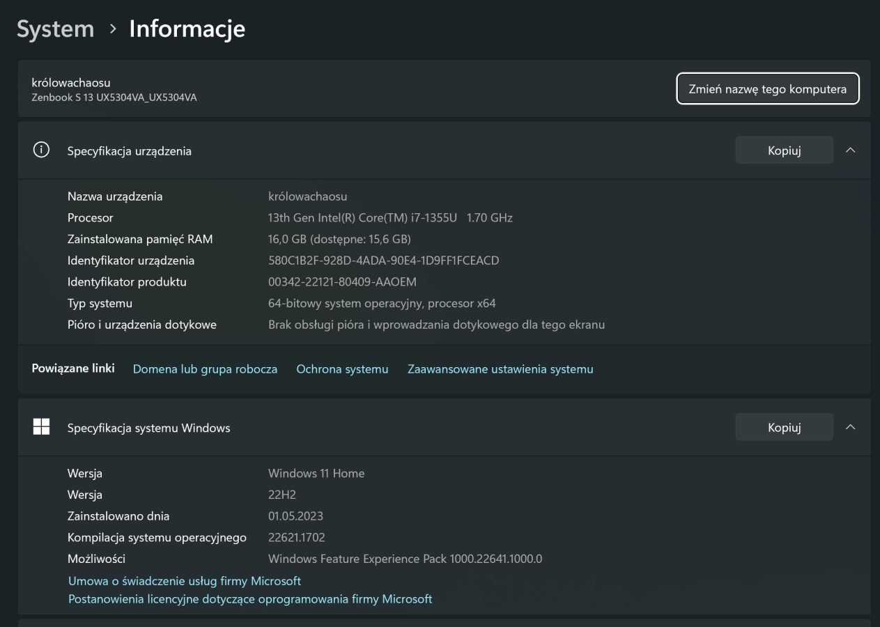 Specyfikacja Asusa Zenbook S 13 OLED 2023 (UX5304):