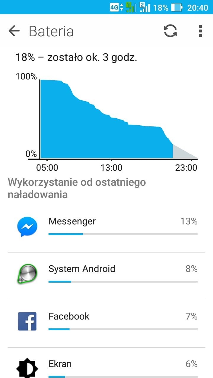 Smukła obudowa nie pozwoliła na umieszczenie w niej zbyt pojemnego ogniwa, dlatego też akumulator legitymuje się pojemnością 2650 mAh. Przy mało wymagających podzespołach daje nadzieję na całkiem niezłe czasy pracy. Przy korzystaniu z Dual SIM, LTE i automatycznie regulowanej jasności ekranu ZenFone Live wytrzymywał na włączonym ekranie (SoT, Screen-on-Time) około 3,5-4 godzin, natomiast przy Wi-Fi był w stanie osiągnąć wynik do 5 godzin. W praktyce przekłada się to na niecały jeden dzień pracy.
