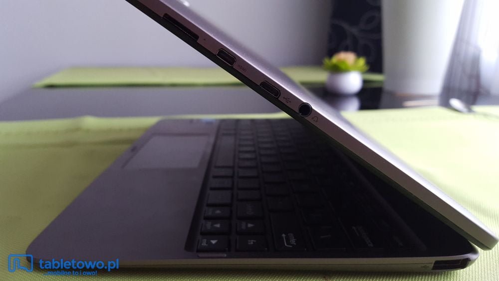Przyjrzyjmy się krawędziom tabletu. Na lewym boku mamy port USB typu C i przyciski do regulacji głośności. U góry umieszczono włącznik i diodę LED. Na prawej krawędzi z kolei znajdziemy slot kart microSD, wyjście microHDMI, port microUSB oraz 3.5 mm jack audio. Dół poświęcony został na otwory, w których chowają się wtyki stacji dokującej.