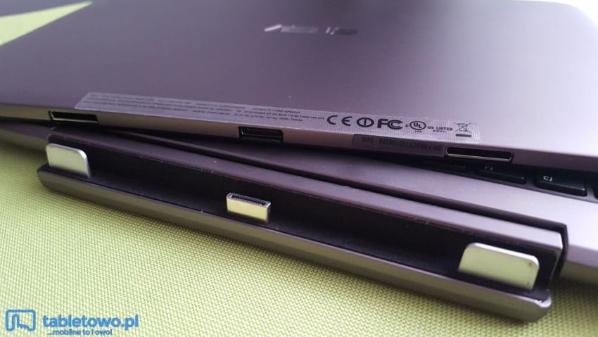 Na uwagę zasługuje przede wszystkim fakt, że w przeciwieństwie do poprzednich modeli należących do serii T100, tutaj zastosowano nieco inny mechanizm łączenia części tabletowej z klawiaturą. Wcześniej mieliśmy dedykowany przycisk zwalniający połączenie, tu natomiast go zabrakło. Wszystko przez to, że mamy do czynienia z neodymowym magnesem, który idealnie łączy obie części urządzenia. Aby odłączyć je od siebie należy użyć całkiem sporo siły – nie ma mowy o przypadkowym rozłączeniu klawiatury od ekranu.