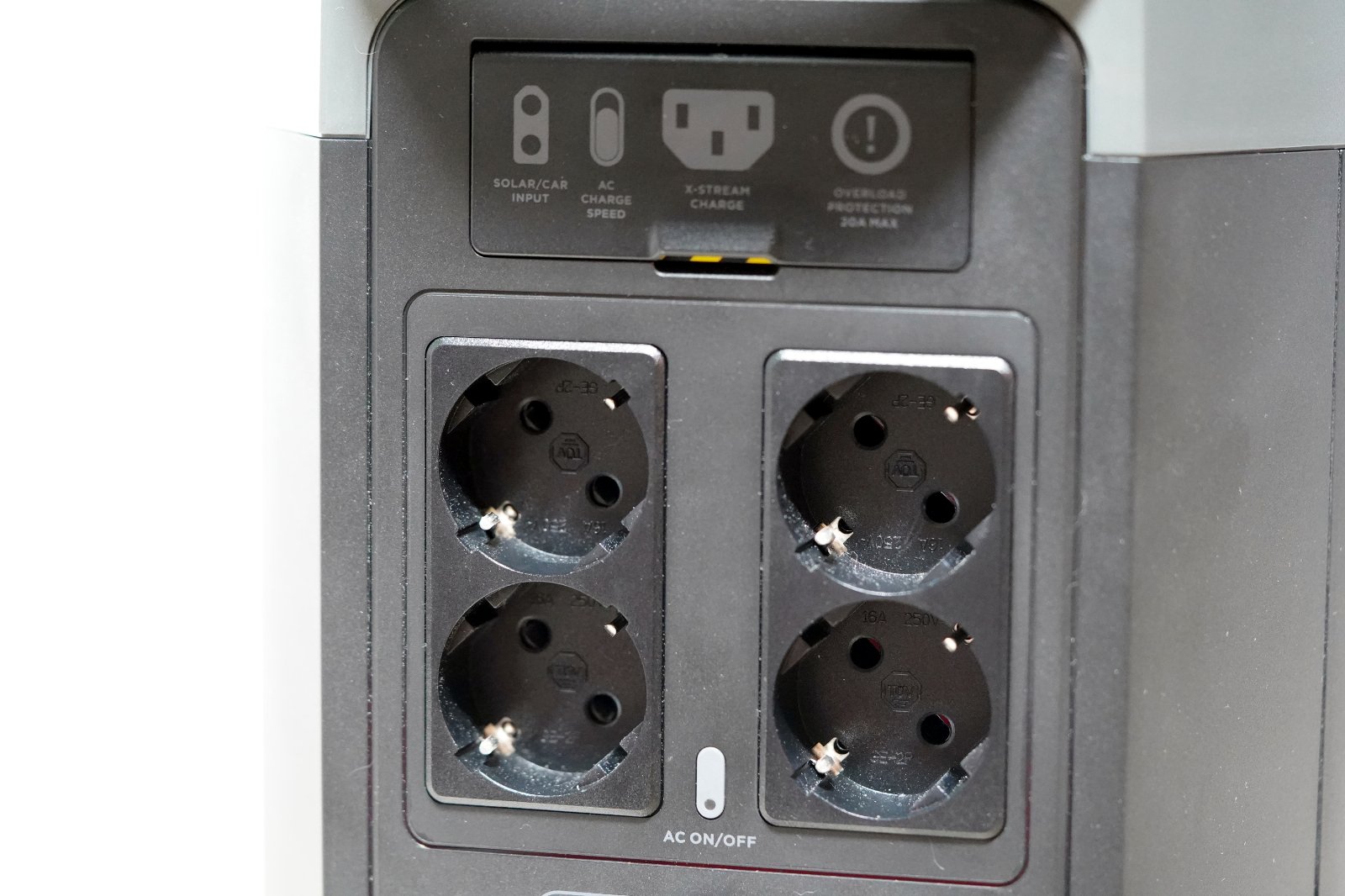 Po przeciwnej stronie, czyli na drugim boku, umieszczone zostało gniazdo zapalniczki samochodowej, cztery gniazda sieciowe AC (230 V), a także – pod dość solidną zaślepką – gniazdo ładowania przenośnej stacji zasilania, port ładowania solarnego oraz przełącznik szybkości ładowania.