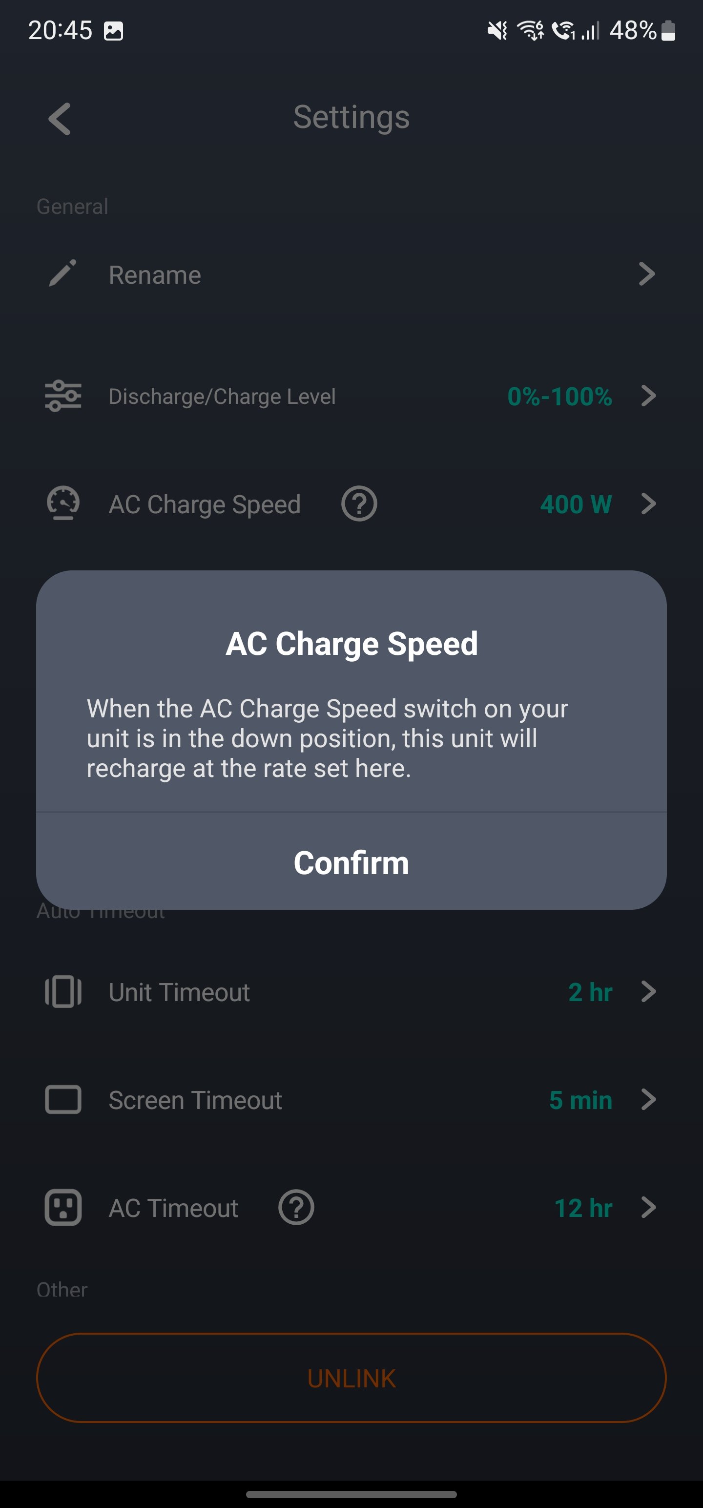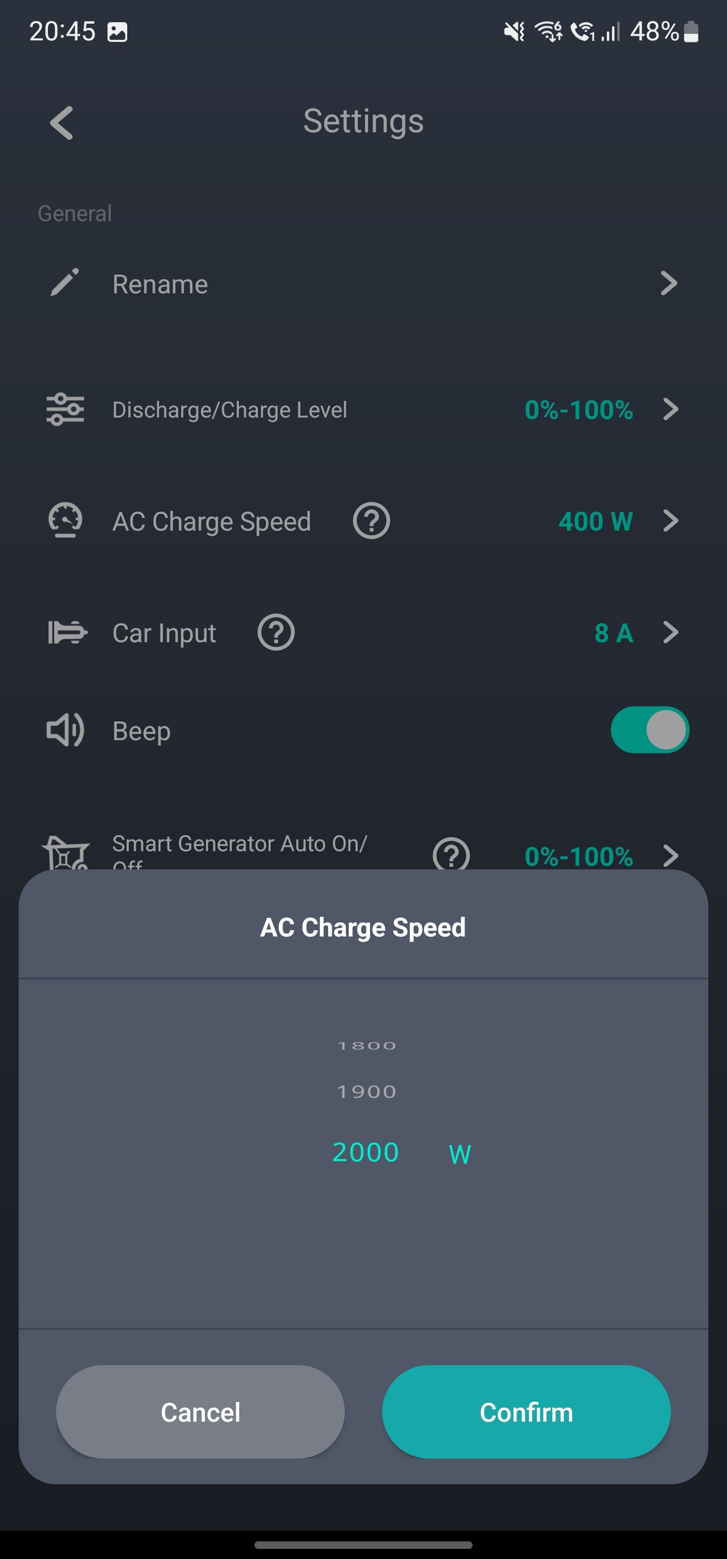 Korzystając z Delta Max warto też zajrzeć do ustawień, bo tam kryje się sporo ciekawych opcji. Możemy ustawić górną granicę poziomu ładowania stacji (niekoniecznie musi być to maks. 100%), natężenie prądu dla gniazda zapalniczki (4, 6 lub 8 A) czy szybkość ładowania gniazdem AC (maks. 2000 W).