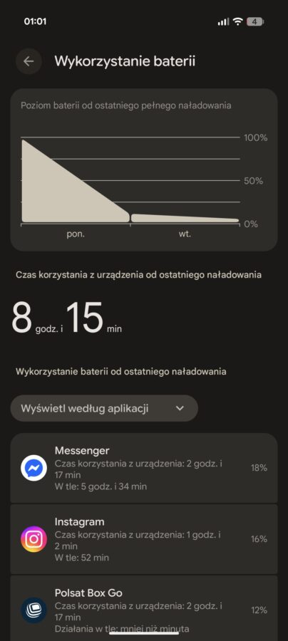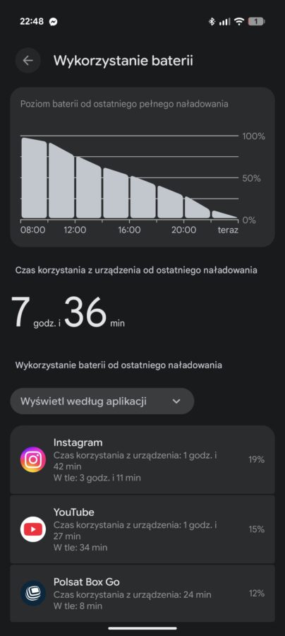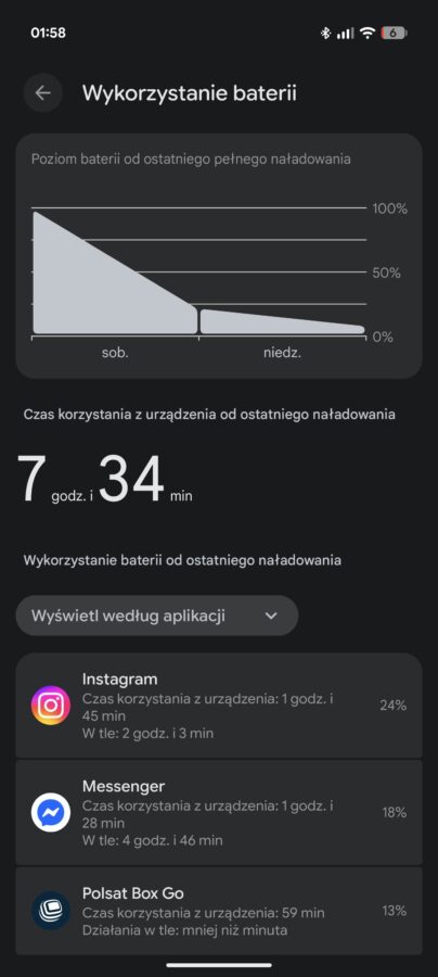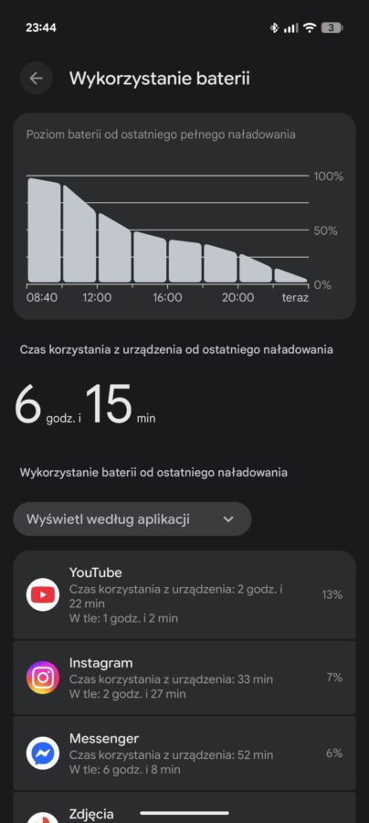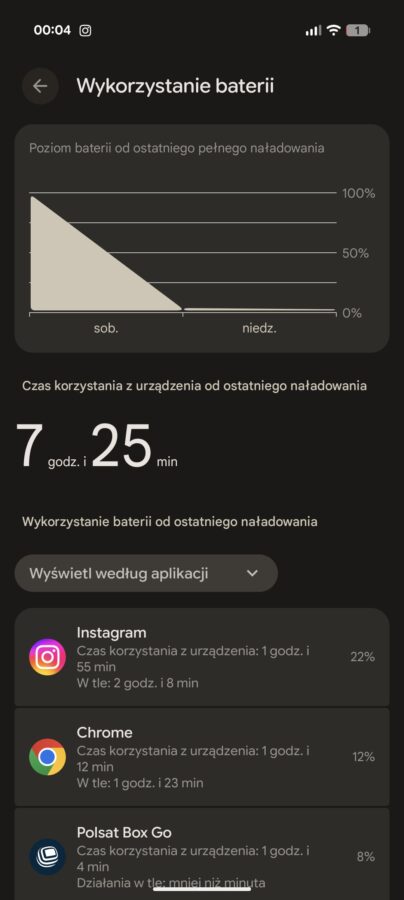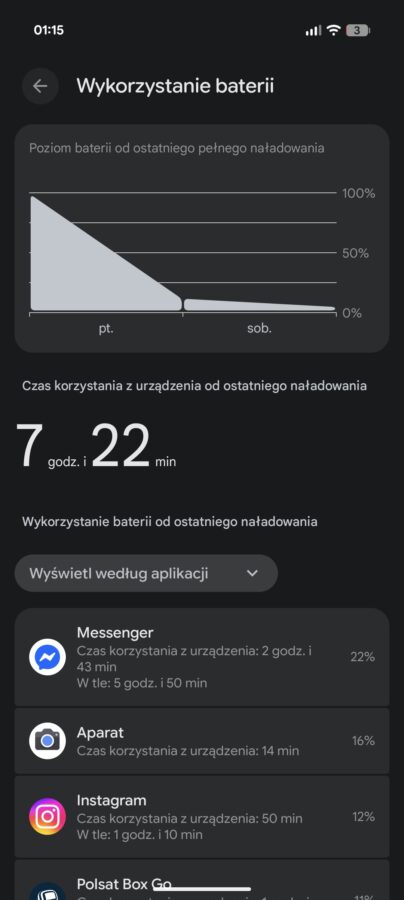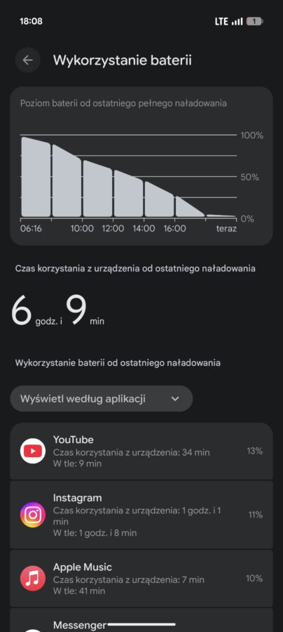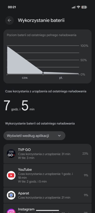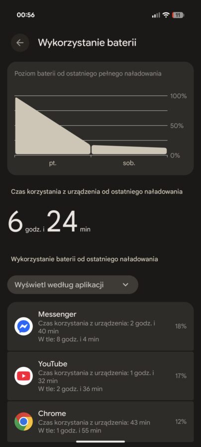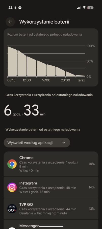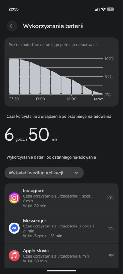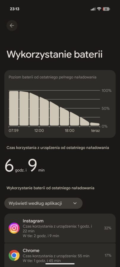 Zazwyczaj, telefon odłączony rano, około godziny 8:00, podłączenia do prądu domagał się w okolicach 23:00-24:00 i był to wysoce powtarzalny scenariusz. W momencie, gdy dzień rozpocząłem dużo wcześniej, bo chwilę po 6:00 i przez cały czas korzystałem z telefonu poza domem na sieci 5G, rozładowanie do 1% nastąpiło o 18:00. Była to jednak pojedyncza sytuacja.
