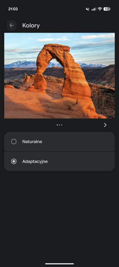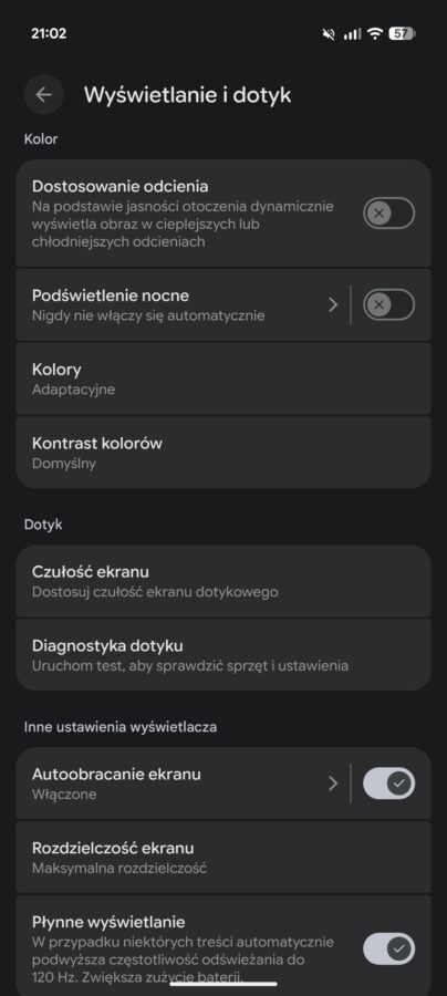 Sekcja ustawień pozwala nam zmienić sposób wyświetlania barw (do wyboru są dwa tryby – adaptacyjne i naturalne), kontrast kolorów, włączyć automatyczne dostosowywanie temperatury barwowej i w razie potrzeby wyłączyć płynne wyświetlanie, obniżając wówczas odświeżanie z adaptacyjnych 120 Hz do 60 Hz (domyślnie jest ono aktywne). Jest też opcja zmiany rozdzielczości ekranu, przy czym fabrycznie, od wyjęcia z pudełka, ustawiona jest niższa, czyli Full HD.