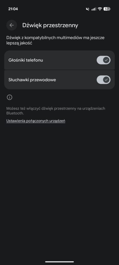 Nie ma tu, niestety, wsparcia dla Dolby Atmos, co też sprawia, że nie jesteśmy w stanie odtwarzać dźwięku w tym formacie, np. w serwisach streamingowych Apple Music i Tidal. W ustawieniach audio jest co prawda funkcja o nazwie dźwięk przestrzenny, jednakże nie wnosi ona drastycznych efektów poza odrobinę większą głębią. Brakuje też szerszych ustawień dźwięku, jak choćby podstawowego korektora.