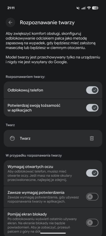 Oznacza to, że im jaśniej, tym proces skanowania rys twarzy odbywa się szybciej, ale już gdy znajdujemy się w ciemnym pomieszczeniu, cała weryfikacja wyraźnie się wydłuża. Sprawia to, że – osobiście – zdecydowanie bardziej wolę korzystać z czytnika linii papilarnych.
