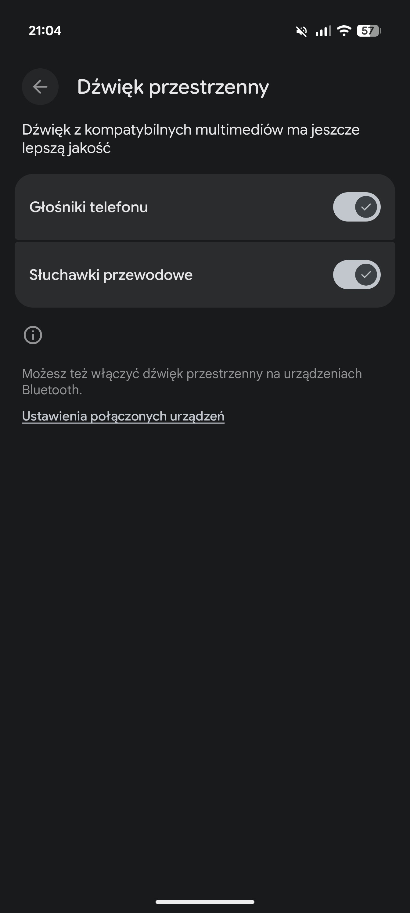 Nie ma tu, niestety, wsparcia dla Dolby Atmos, co też sprawia, że nie jesteśmy w stanie odtwarzać dźwięku w tym formacie, np. w serwisach streamingowych Apple Music i Tidal. W ustawieniach audio jest co prawda funkcja o nazwie dźwięk przestrzenny, jednakże nie wnosi ona drastycznych efektów poza odrobinę większą głębią. Brakuje też szerszych ustawień dźwięku, jak choćby podstawowego korektora.