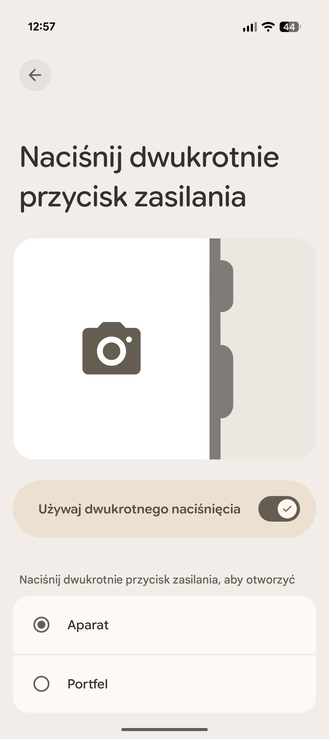 - wciśnięcie dwukrotnie przycisku zasilania, aby włączyć Aparat lub Portfel Google,
