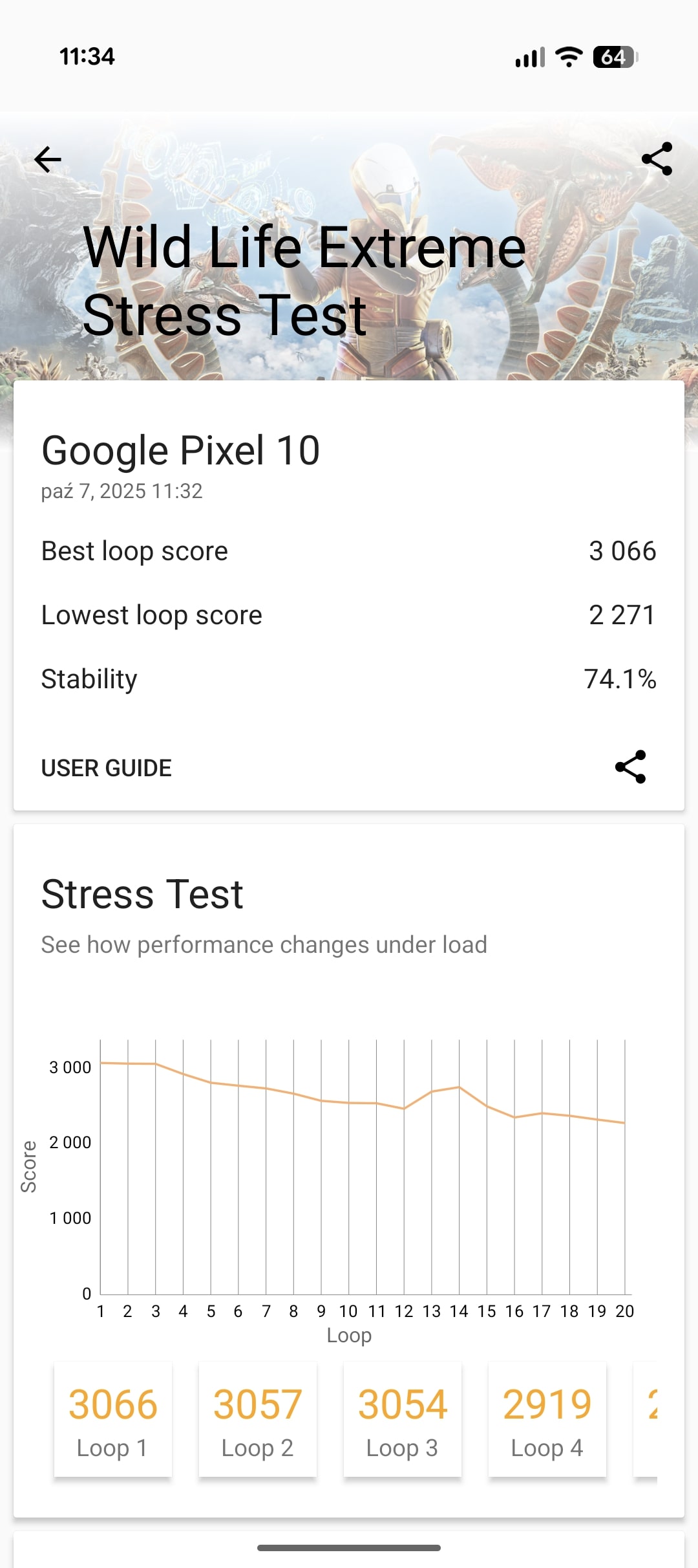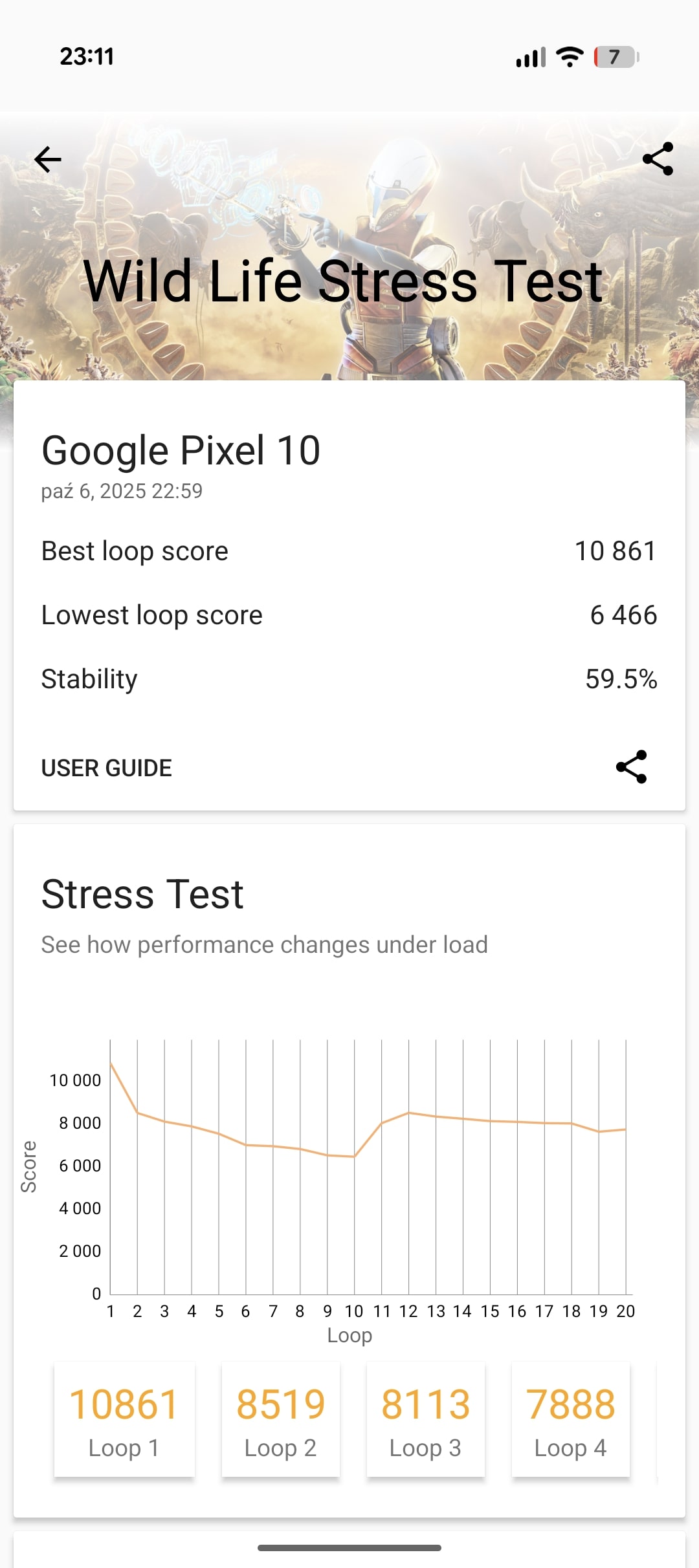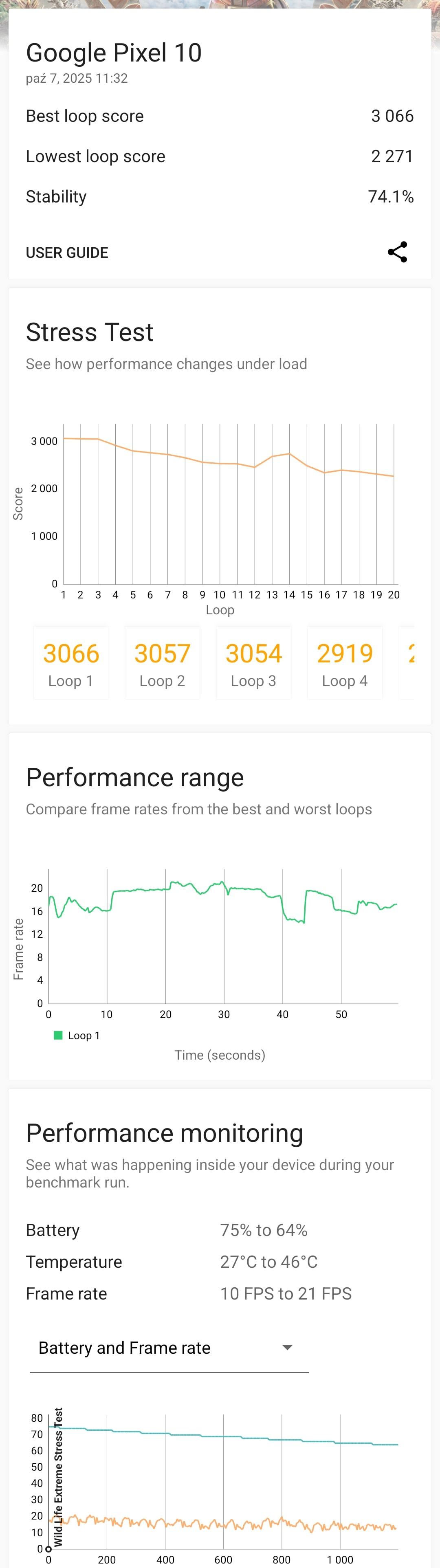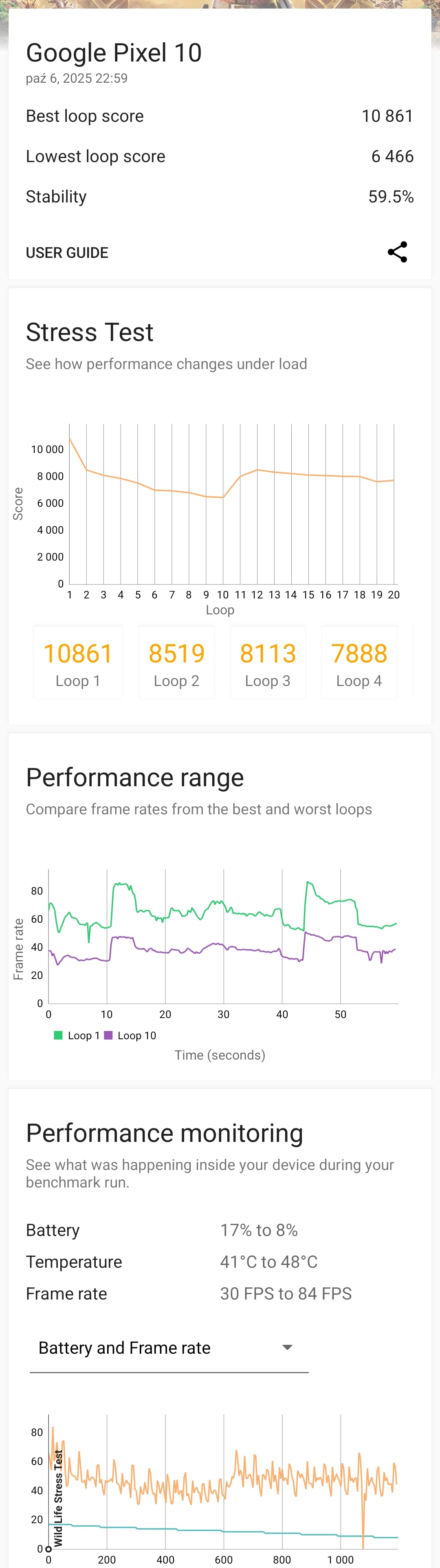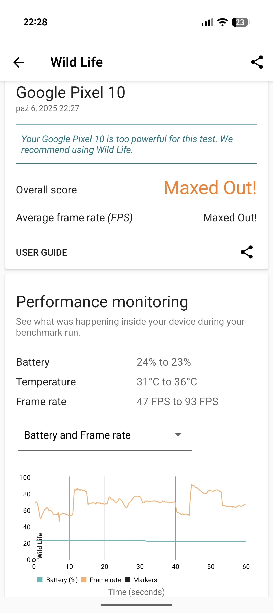 Stress testy, badające wydajność pod obciążeniem, są już bardziej łaskawe. Pixel 10 nawet podczas długich 20-minutowych pętli zadań nie wykazywał skłonności do przeistoczenia się w przenośną patelnię do smażenia. Jasne – tył urządzenia, tuż pod wyspą aparatów, robił się wyraźnie cieplejszy, ale nie musiałem się obawiać, że zaraz coś się spali. Nie ma uczucia dyskomfortu podczas trzymania tak nagrzanego telefonu.