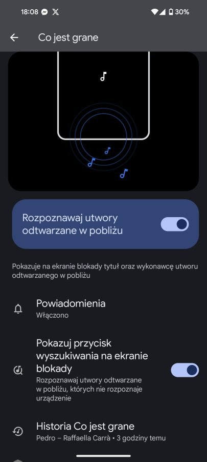 Możemy też włączyć funkcję Co jest grane, która nasłuchuje muzyki w naszym otoczeniu i wyświetla na ekranie blokady tytuł oraz wykonawcę. I działa to naprawdę dobrze.