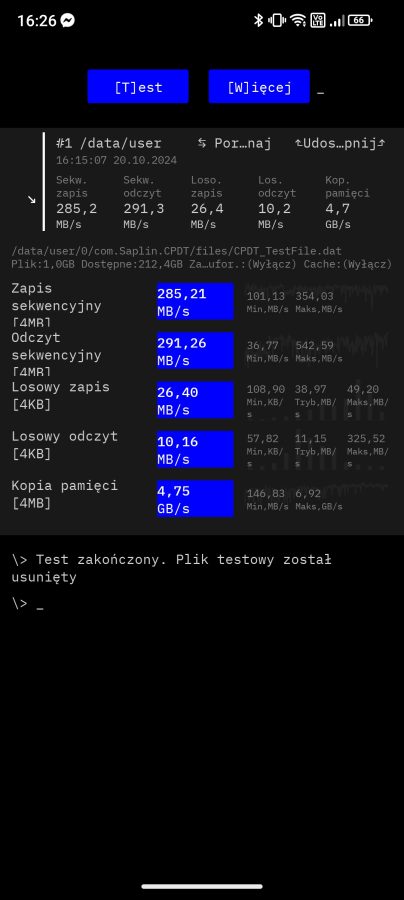 Telefon jest wyposażony w 256 GB pamięci wewnętrznej (227 GB zostaje do wykorzystania), którą – co ważne – można rozszerzyć z użyciem slotu kart microSD o nawet 1 TB. Szybkość pamięci standardowo przetestowana w CPDT: