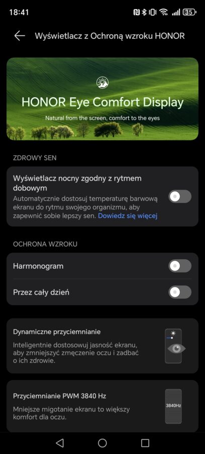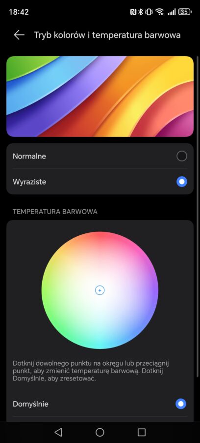 Użytkownicy mają w ustawieniach możliwość wyboru pomiędzy stałym 60 Hz lub 120 Hz, a także automatycznym dostosowywaniem częstotliwości odświeżania. Znalazła się tu również możliwość włączenia motywu ciemnego/jasnego lub automatycznego przełączania między nimi. Można także dowolnie kontrolować tryb ochrony wzroku oraz e-książki (który w zasadzie oznacza przejście w tryb monochromatyczny). Producent daje także użytkownikom możliwość wyboru trybu kolorów z opcją zmiany temperatury barwowej. To coś, co zawsze doceniam, ponieważ dla niektórych osób domyślne kolory mogą być nieco zbyt mocno nasycone.