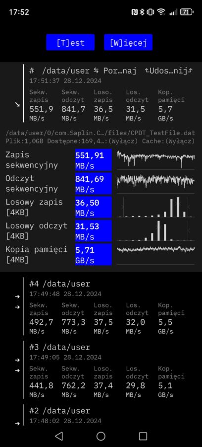 Ostatnia garść liczb będzie dotyczyć szybkości pamięci wewnętrznej. Honor Magic 7 Lite został przez producenta wyposażony 256 GB miejsca na dane, którego nie można rozszerzyć, ponieważ nie mamy tutaj slotu na karty microSD. Po wykonaniu testów CPDT 5 razy uśredniłem jego wyniki:
