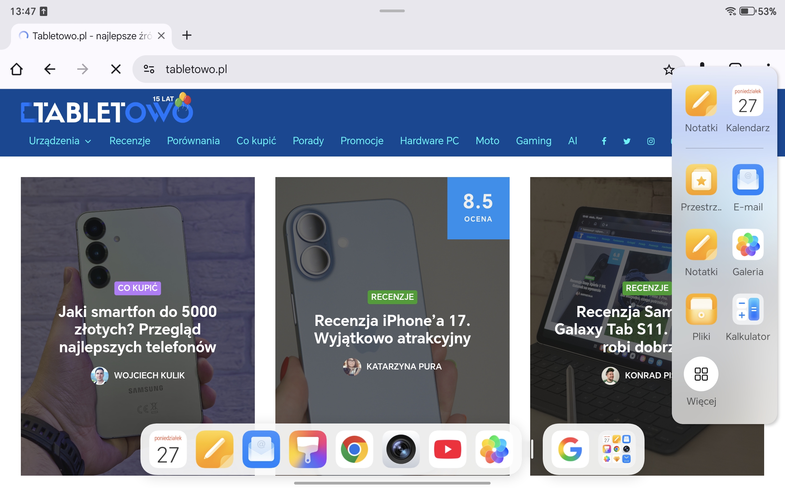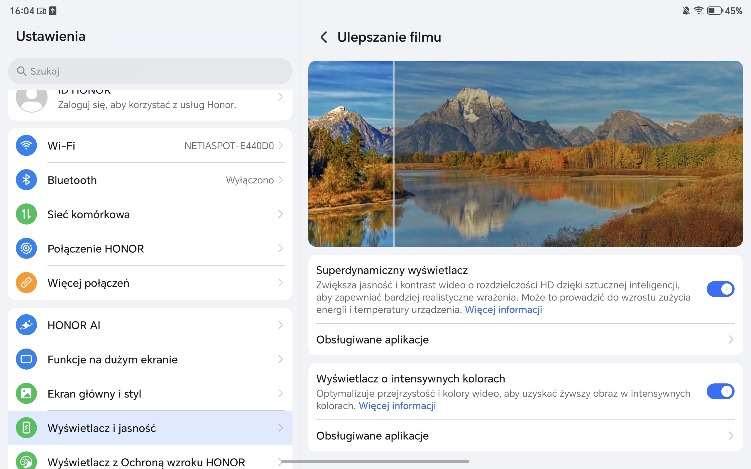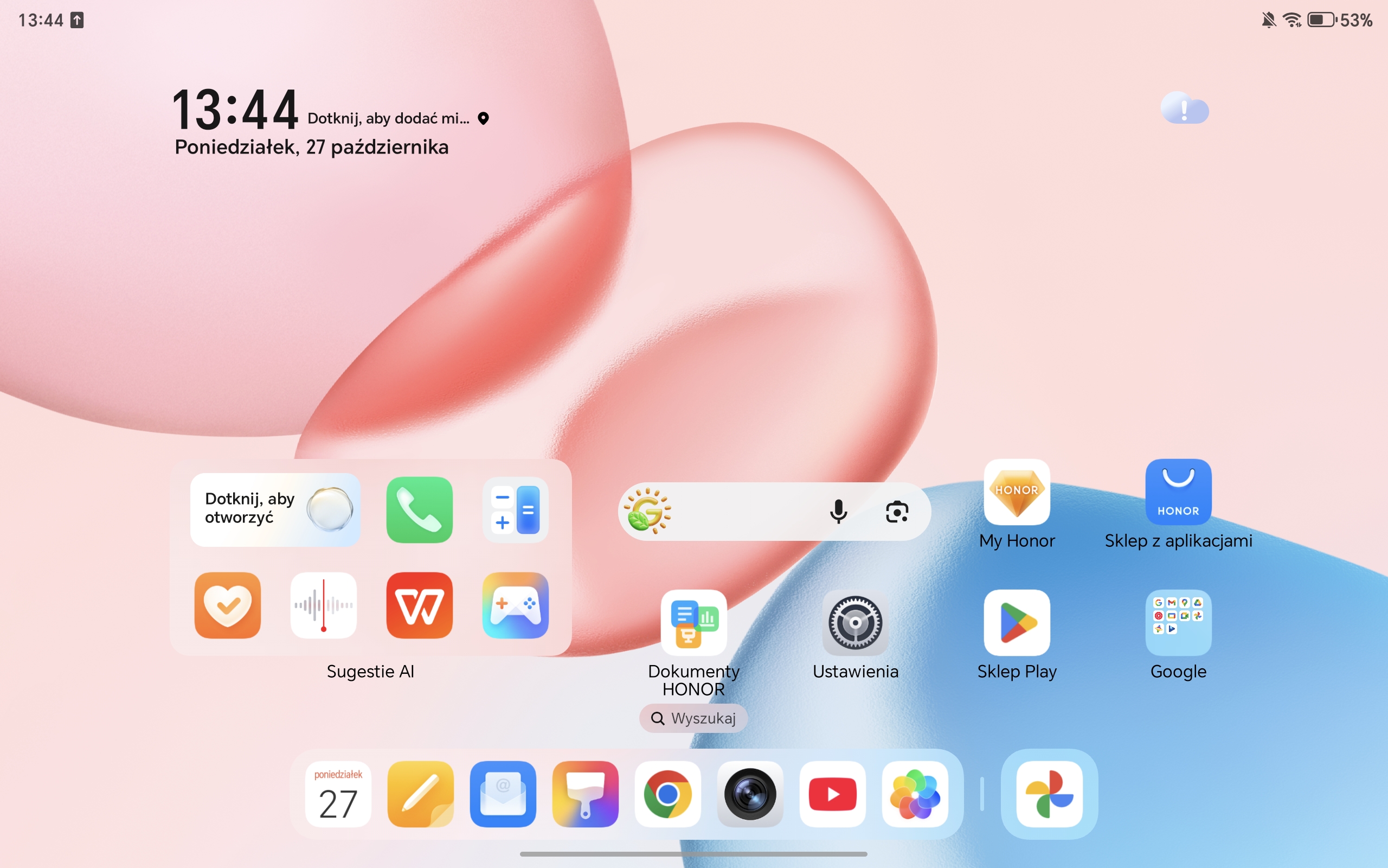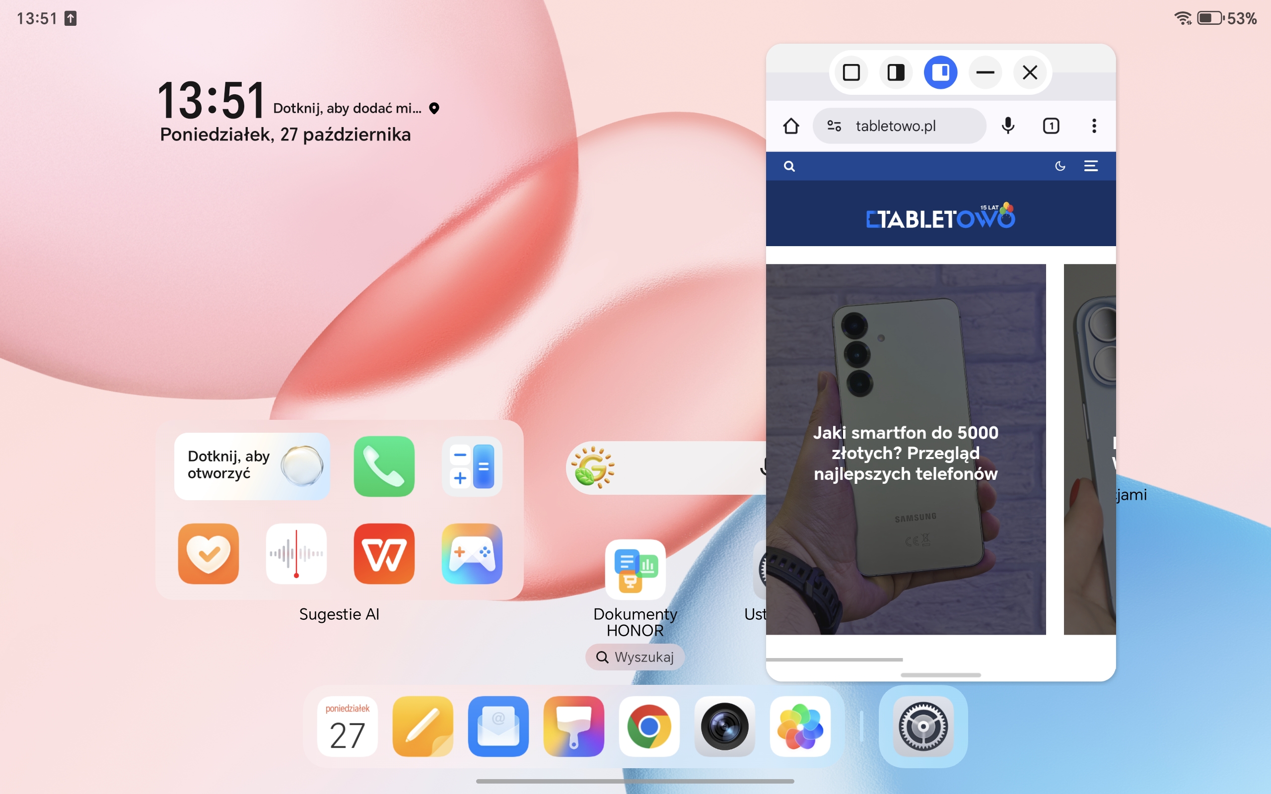 Honor Pad 10 ma spory, bo 12,1-calowy wyświetlacz. Cechuje go wysoka rozdzielczość (2560×1600 pikseli), a system pozwala dobrze wykorzystać tak dużą przestrzeń roboczą (mam tu na myśli rozmaite opcje dzielenia ekranu, o których szerzej wspominam w dalszej części recenzji).