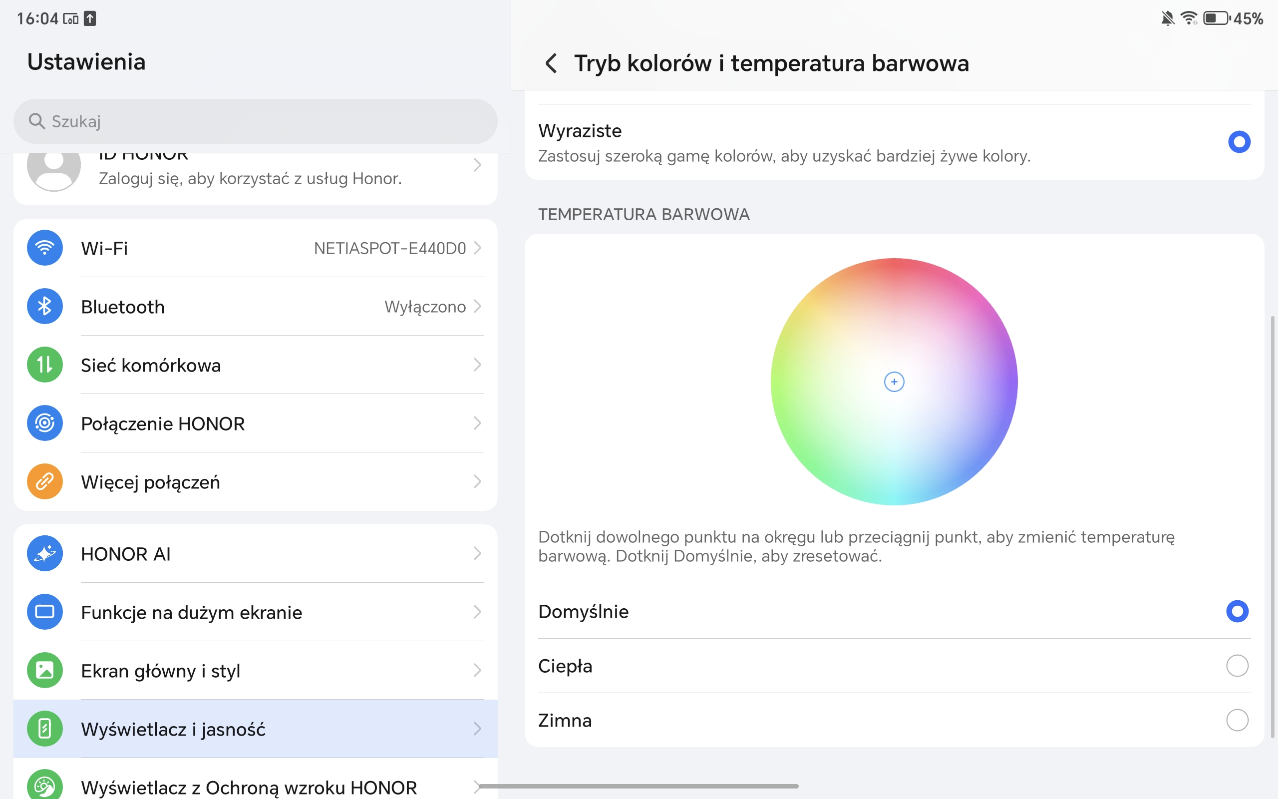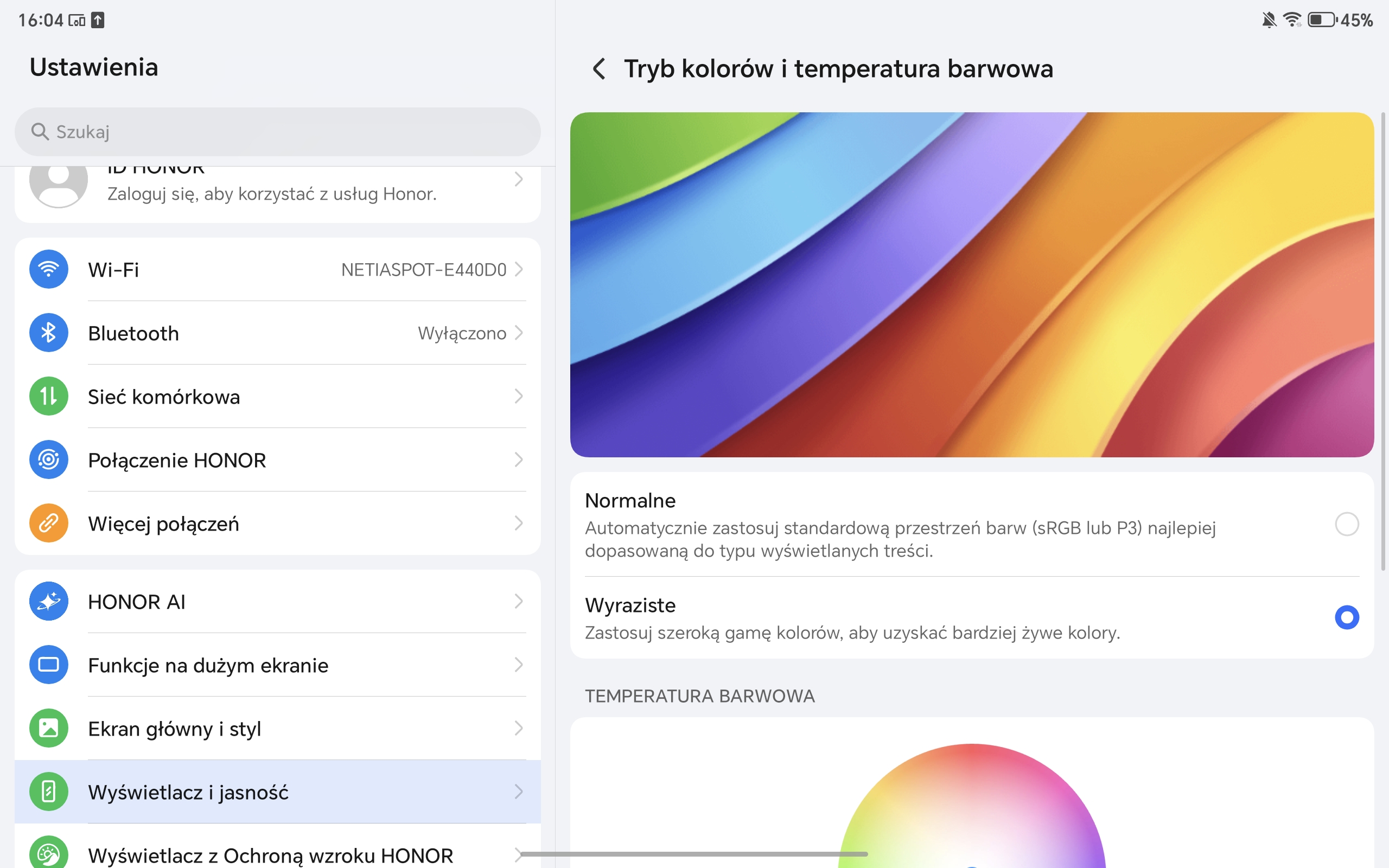 W Ustawieniach możemy sobie także co nieco poustawiać. Wybrać jeden z trybów kolorów (normalne lub wyraziste), zmienić temperaturę barwową (przy użyciu koła RGB), wyregulować częstotliwość odświeżania (60 Hz, 120 Hz lub dynamiczna), jak również zmienić rozmiar i styl poszczególnych elementów interfejsu.