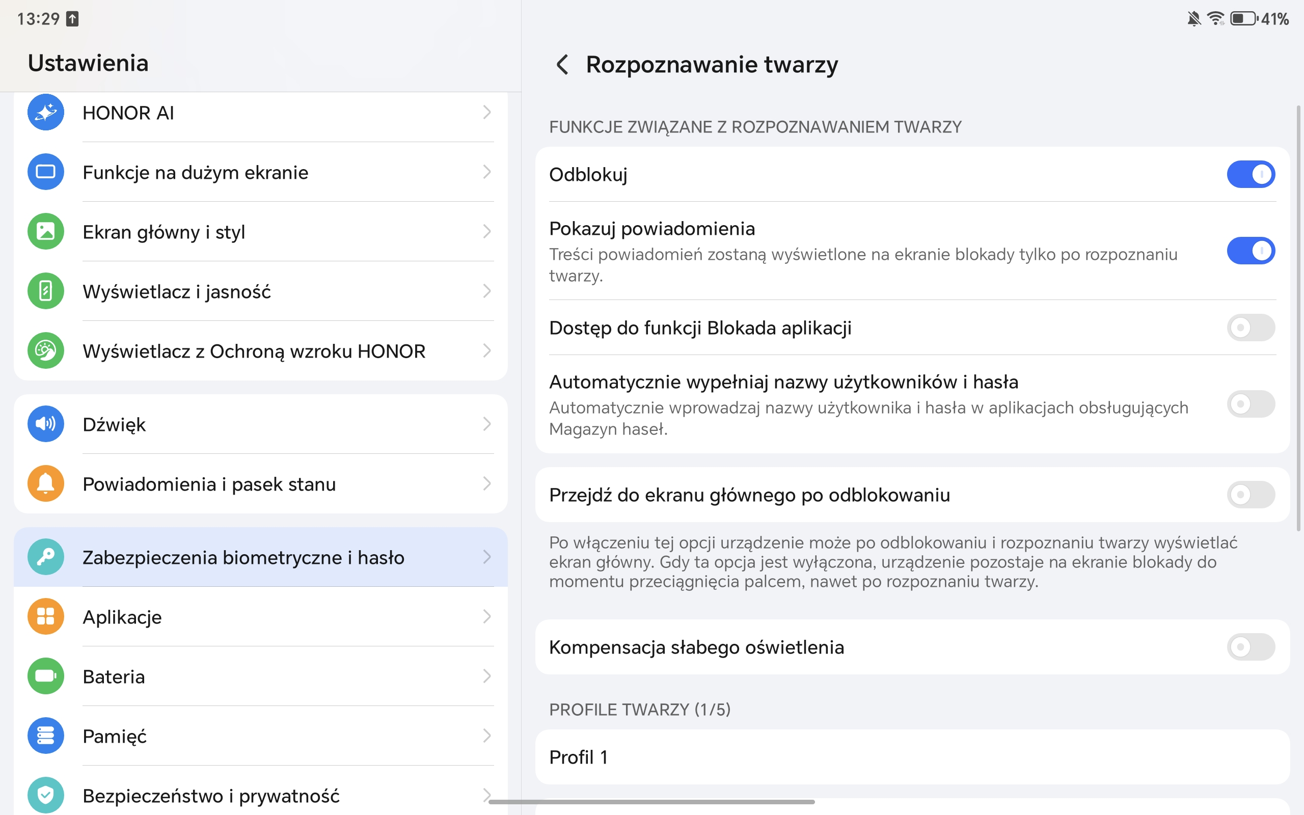 Jeśli chodzi o zabezpieczenia, możemy skorzystać albo z tradycyjnego hasła/PIN-u, albo też z technologii rozpoznawania twarzy. Działa ona bardzo szybko i sprawnie (także przy nie najlepszych warunkach oświetleniowych), ale… nie zapewnia ochrony, jakiej bym oczekiwał. Kilkukrotnie zdołałem bowiem odblokować urządzenie za pomocą zdjęcia wyświetlanego na ekranie monitora (słabo!).