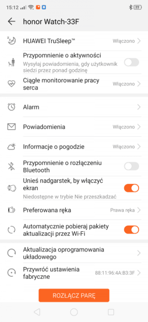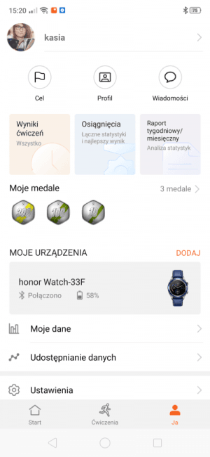 Honora Watch Magic testowałam w połączeniu z telefonem innej chińskiej marki, Oppo, a konkretniej Reno Z, a później Reno 10x Zoom. Musiałam więc pobrać na niego Huawei Health (Huawei Zdrowie) i Mobilne Usługi Huawei. Później wystarczyło wybrać z listy urządzeń posiadany zegarek, zalogować się na konto i gotowe – można było zacząć korzystać z wachlarza funkcji przez niego oferowanych. Urządzenie łączy się ze smartfonami przez Bluetooth 4.2 i jest kompatybilne zarówno z Androidem (od 4.4 KitKat w górę), jak i iOS od 9.0 (aczkolwiek w prost zaznaczam, że w połączeniu z iOS nie testowałam, więc nie dam gwarancji, że wszystko działa dokładnie tak samo i oferowane funkcje dostępne są wszystkie).