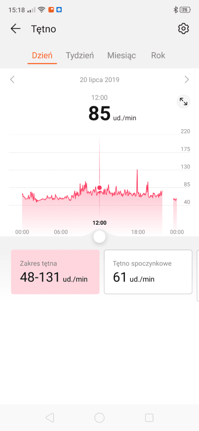 Z poziomu samego zegarka mamy dostęp do ćwiczeń (choć nie są mi aktualnie zbyt bliskie, będzie o nich nieco dalej), wykresu tętna, bardzo podstawowych kółek aktywności, informacji na temat trwania ostatniego snu (dosłownie tylko tyle, nic więcej), barometru, kompasu, pogody (wyświetla tylko stan aktualny, plus temperatury graniczne), stopera, minutnika i alarmu. Jest też funkcja Znajdź telefon, która odpowiada za włączenie na telefonie irytującej, głośnej muzyczki, dzięki której z całą pewnością znajdziemy zagubiony sprzęt, jak również latarka – choć tak naprawdę jest to opcja wyświetlająca białe tło na maksymalnej jasności.