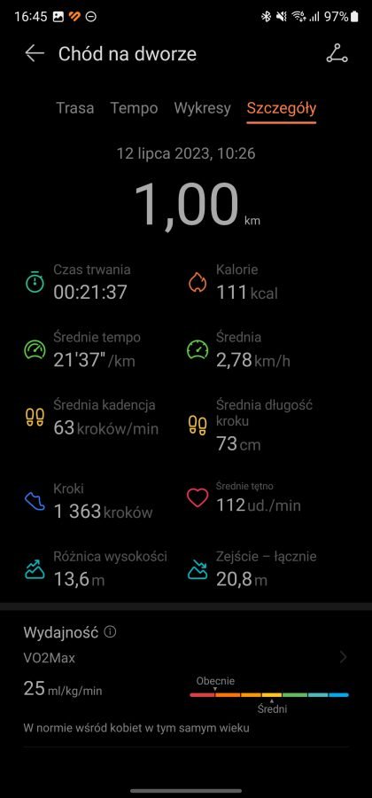 Dziwnie – to chyba najlepsze określenie. W jednym przypadku opaska i zegarek pokazały przejście kilometra, podczas gdy Strava zarejestrowała 1,06 km. W drugim przypadku rozbieżności były większe – Strava: 0,97 km, zegarek: 1,03 km, opaska: 1 km. Wciąż jednak są to wyniki z różnicą w granicach rozsądku.