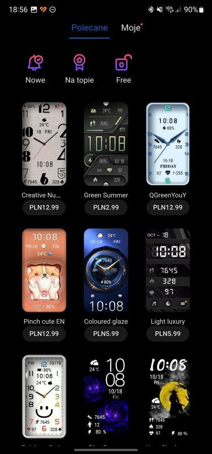 Wyświetlacz AMOLED w Huawei Band 8 ma przekątną 1,47” i rozdzielczość 194 x 368 pikseli. Niezbyt wysoka, ale w rzeczywistości nie patrzymy na opaskę z bardzo bliskiej odległości, dlatego trudno zauważyć postrzępienie ikon czy liter – widać to dopiero przy naprawdę bliskim przyłożeniu opaski do oczu. Czyli nie ma to najmniejszego znaczenia.