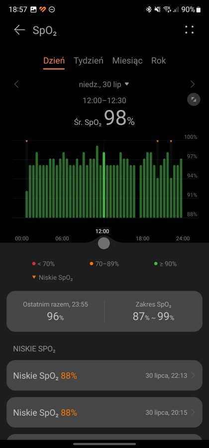 Drugi cykl robiłam podczas dalekiego wyjazdu, ale bez taryfy ulgowej – miałam normalnie dostęp do internetu i stale spływały powiadomienia. Wylatując miałam 64%, po powrocie piątego dnia na ekranie widniało jeszcze 25% zapasu. Ostatecznie bateria w opasce padła 12 dnia od ostatniego ładowania.